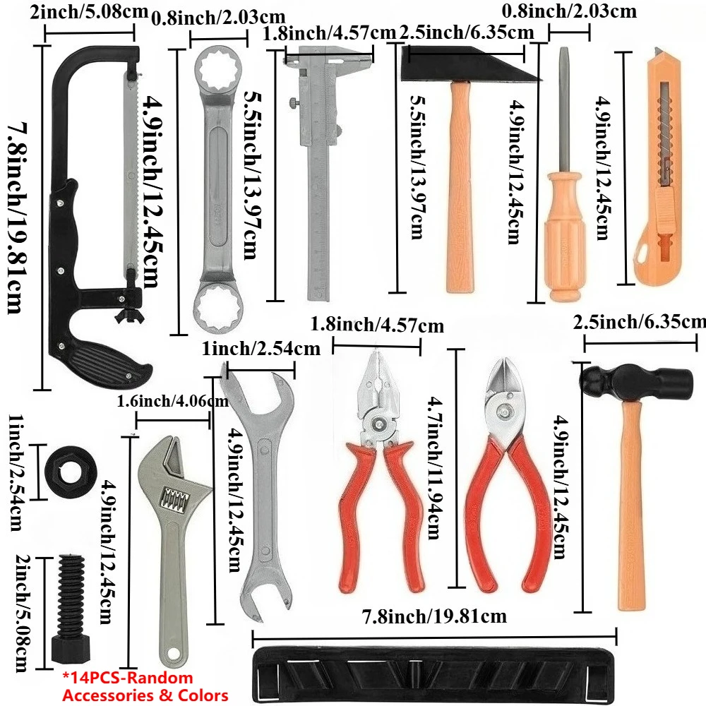 ENSEMBLE DE 14 PICES (Accessoires et couleurs aléatoires) : Comprend 14 outils de jouet tels que un tournevis, une pince, une hache, une scie à main, une clé à molette, un marteau, etc.