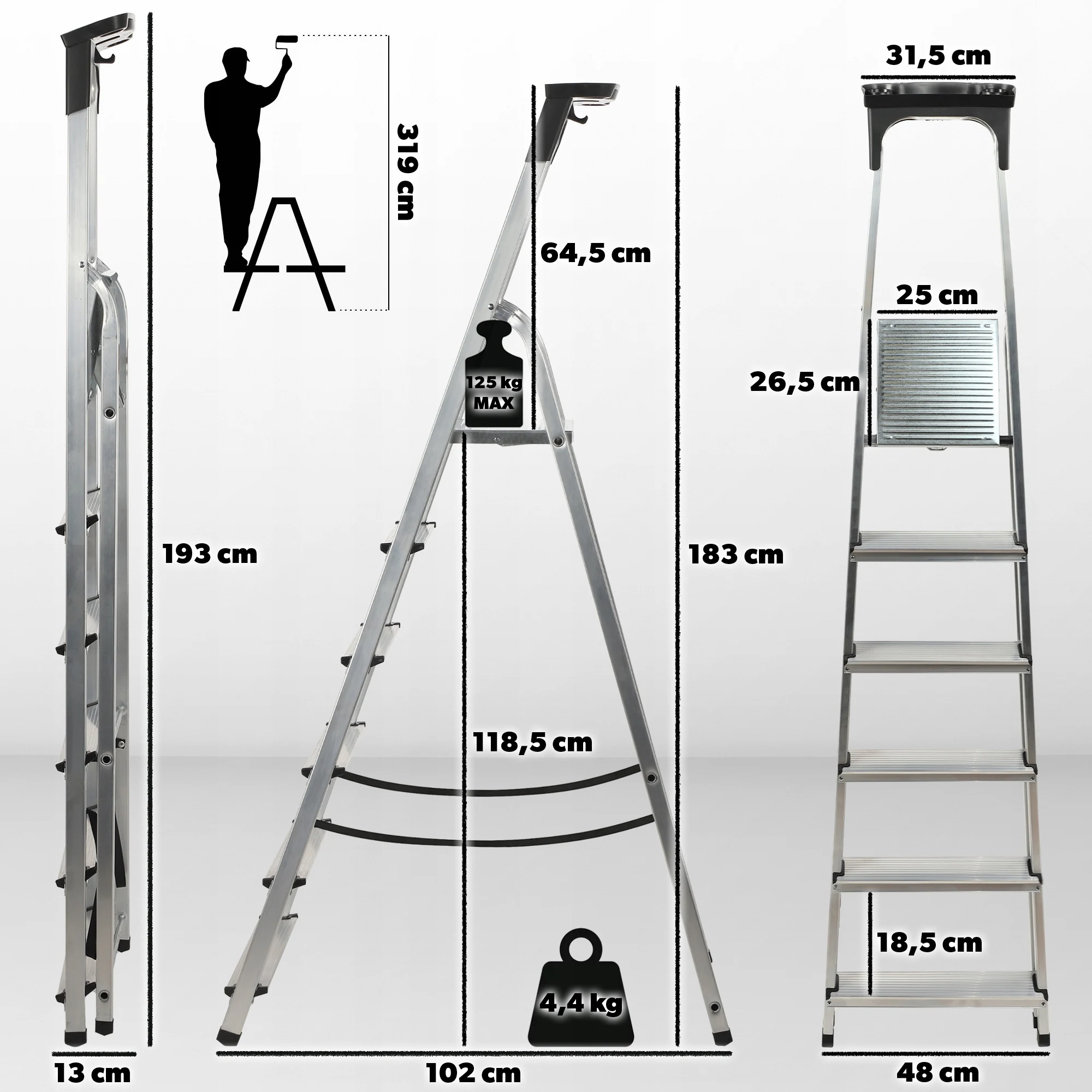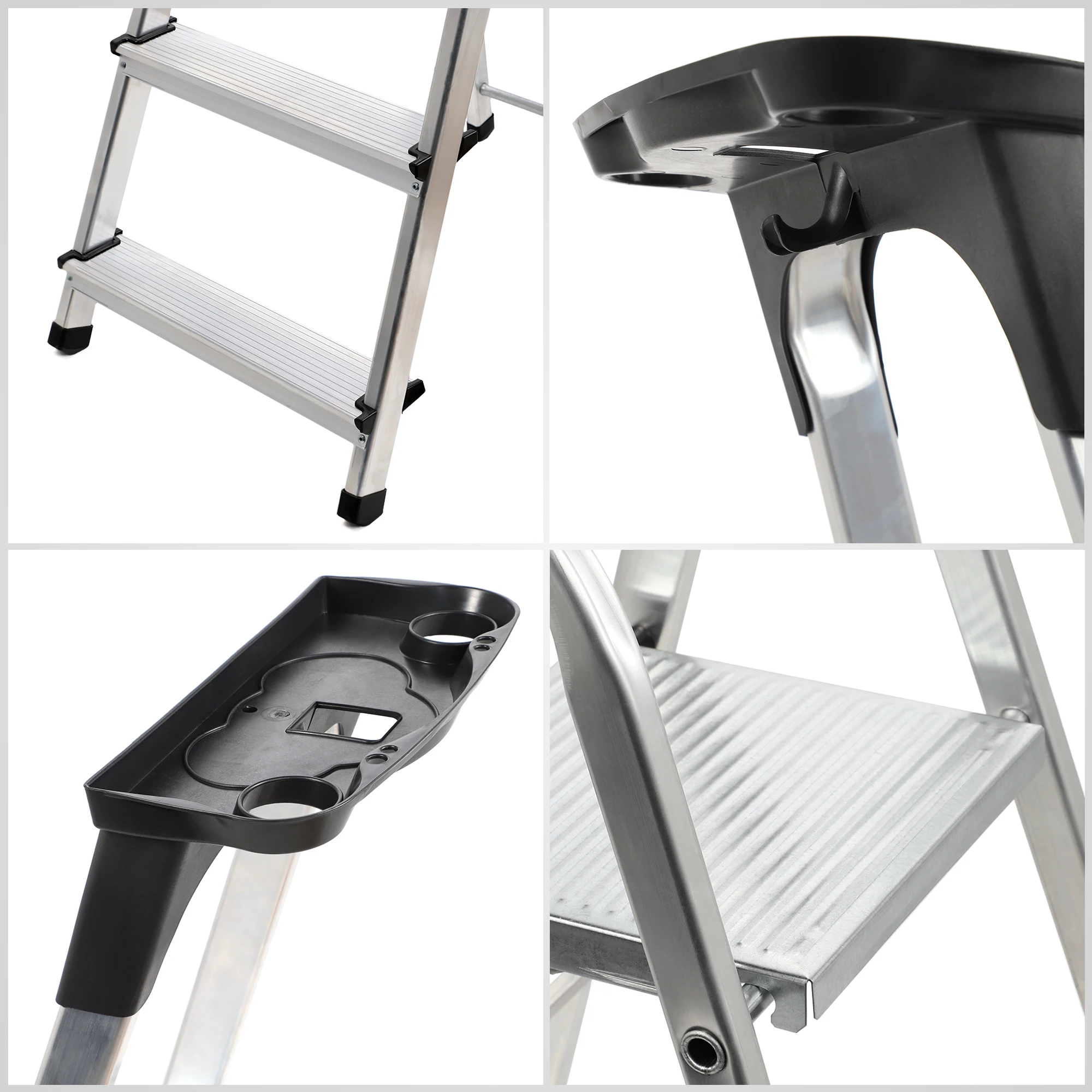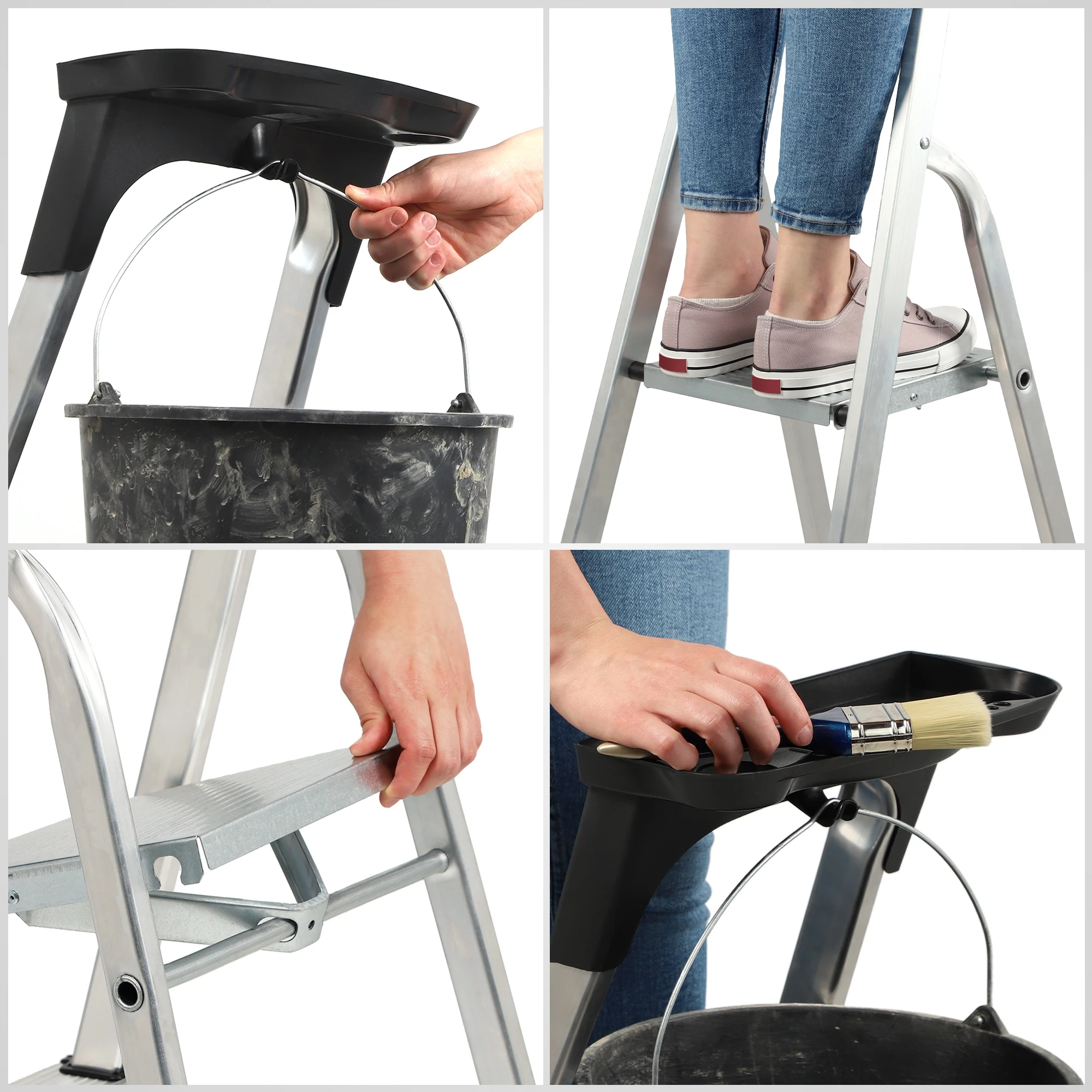 Échelle domestique en aluminium avec étagère 125Kg Vous recherchez une échelle qui fonctionnera lors d'une rénovation ou d'un travail quotidien?Un outil solide pour travailler à une petite hauteur?Une échelle en aluminium avec une étagère pour outils est un équipement inestimable qui devrait être dans chaque maison.Vous l'apprécierez certainement au cours des rénovations occasionnelles, ainsi que lors de l'exécution des tâches ménagères.La conception de l'échelle confortable et durable garantit la sécurité d'utilisation et la facilité d'utilisation.Voyez pour vous à quel point notre échelle domestique est fonctionnelle! Échelle domestique pratique avec crochet et étagère à outils L'échelle en aluminium est un équipement pratique qui sera utile au quotidien.Grâce à elle, vous pouvez atteindre des racks supérieurs, et la rénovation ou un nettoyage complet ne sera pas un problème.Une capacité de charge élevée allant jusqu'à 125 kilogrammes permet de le transporter sur une échelle, par ex.Un seau de peinture et accrochez-le à un crochet spécial à l'étagère.L'étagère, à son tour, permet d'avoir tous les instruments utiles à portée de main, tels que : brosses, rouleaux, marteaux et tournevis.Sa capacité de levage maximale est de 10 kg. Escabeau stable avec plate-forme large L'échelle en aluminium est équipée d'un atterrissage fonctionnel et large, qui assure le confort de travail.De plus, il dispose d'un bandeau de 60 cm qui protège contre les chutes.Il est important encore, l'outil est doté de frappes solides qui garantissent la stabilité de l'ensemble de la structure.Ainsi que des marches dentelées sécurisées, qui sont rivetées et fixées en outre avec des boîtiers en plastique.L'ensemble est complété par des pieds antidérapants, vous pouvez donc être sûr que vous ne tomberez pas pendant l'utilisation. Échelle en aluminium légère et sûre L'outil est fabriqué en aluminium durable et léger, vous n'aurez donc pas de problèmes pour l'emporter en voyage.Grâce à sa taille compacte, notre échelle en aluminium se glissera facilement dans le coffre d'une voiture, un garage ou un compartiment à outils.Il convient d'ajouter que l'équipement est très facile à déplier et à plier, il est donc vraiment simple et agréable à utiliser.Vous l'apprécierez surtout si vous utilisez l'échelle régulièrement. Échelles en aluminium durables avec 3, 4 ou 5 marches L'échelle pliante est dotée d'une entrée unilatérale avec une plateforme sécurisée. Sa conception résiste aux dommages mécaniques, elle durera donc longtemps. L'escabeau est proposé en trois versions. Ce sont des variantes de 3, 4 ou 5 niveaux. Choisissez le modèle qui fonctionnera le mieux dans votre étui et profitez d'une échelle sûre pour un usage quotidien. Recherchez une échelle stable qui vous offrira le bon confort de travail!
