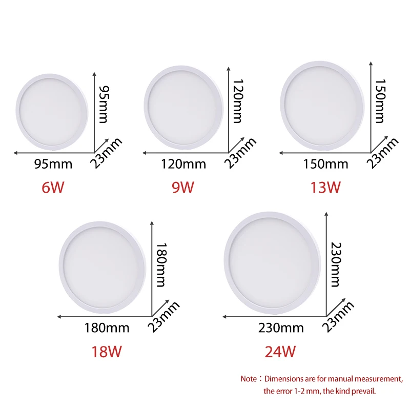 Description du produit: Puissance: 6W 9W 13W 18W 24W Tension: AC 85-265V Matériel: PC + ABS Zone d'éclairage: 6W:⌀ 95mm (5-8 mètres carrés) 9W:⌀ 120mm (9-12 mètres carrés) 13W:⌀ 150mm (12-15 mètres carrés) 18W:⌀ 180mm (15-18 mètres carrés) 24W:⌀ 230mm (18-25 mètres carrés) Type de puce LED: Puce SMD 2835 Température de couleur: blanc chaud (2700-3500K) /blanc froid (5500-6500K) Indice de rendu des couleurs: (Ra) >80 Angle de faisceau (deg): 120 Température de fonctionnement: -20 ℃ à 60 ℃ Style d'installation: monté en surface Garantie: 1 ans Durée de vie: >50000 heure Application: Foyer/Salle à manger/Salon/Salle de bain/Chambre à coucher/Cuisine/Tout éclairage intérieur. Paquet: 1 * Led Plafonnier