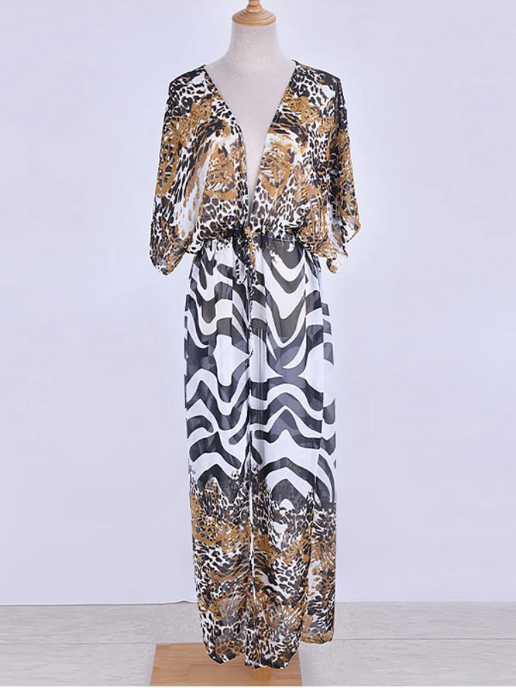 Kimono de plage en mousseline de soie pour femmes, imprimé léopard, longue Cape pour maillot de bain, tunique, vêtements de plage d'été, approvisionnement d'usine