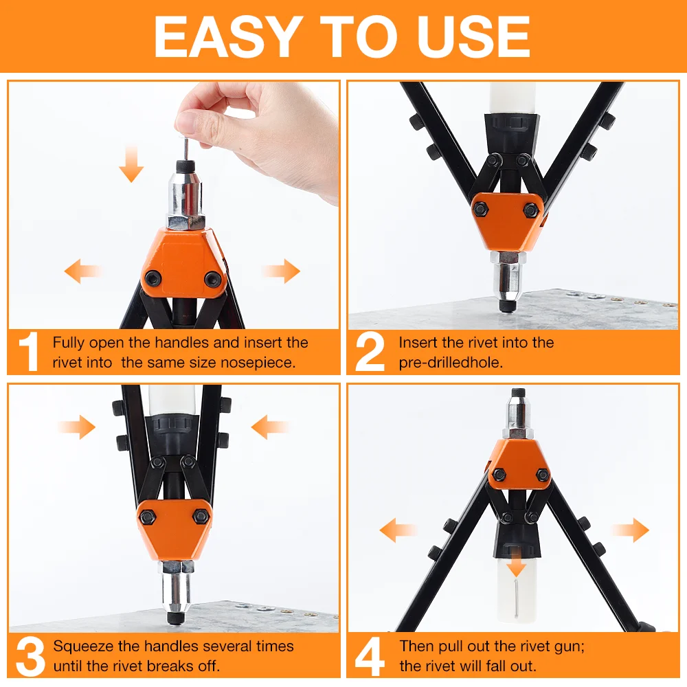 Avec de longues poignées, il permet un effet de levier maximal pour s'attaquer facilement aux rivets en aluminium jusqu'à 1/4 ; Sa conception ergonomique des poignées vous offre un travail de rivetage confortable et efficace!