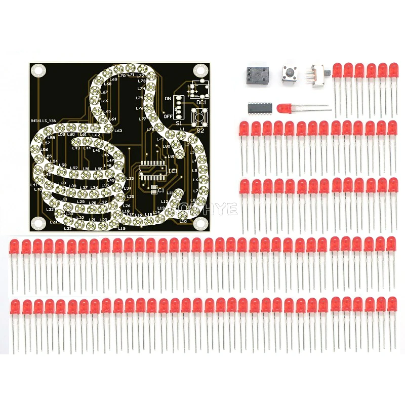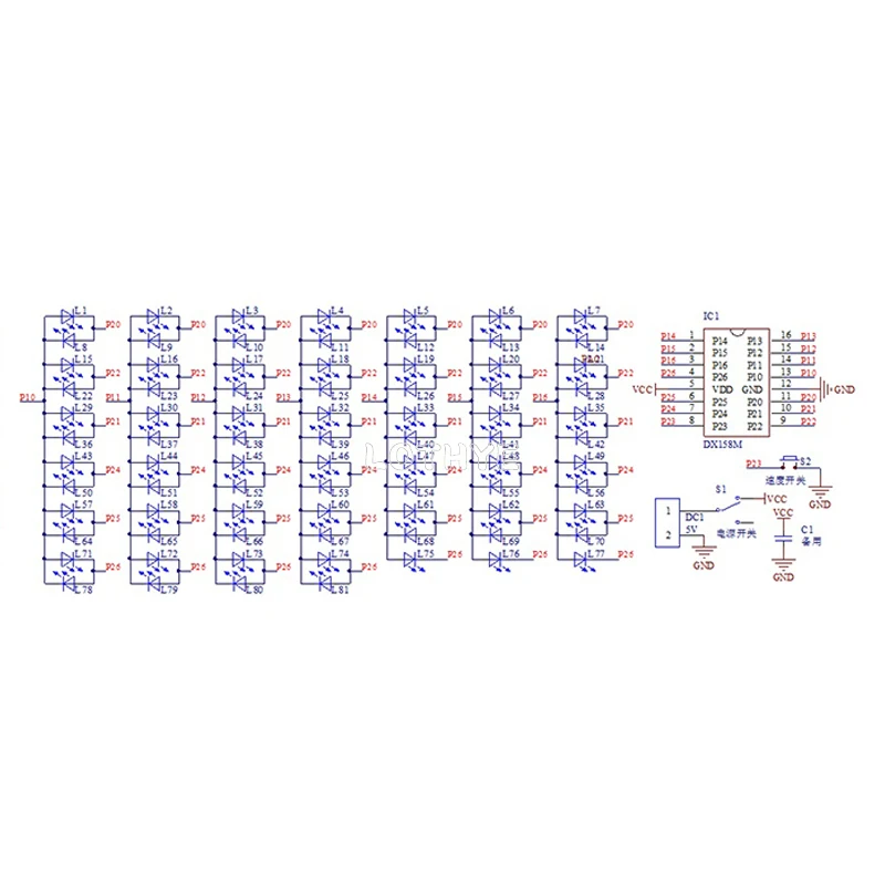 81 LED sont connectées à un microcontrôleur dédié DX158 via une combinaison de lignes et de colonnes, et sont numérisées et entranées pour s'allumer de la manière souhaitée via le programme microcontrôleur.Le programme microcontrôleur de ce kit a été brûlé et soudé pour produire l'effet souhaité.DC1 est une prise de courant compatible à la fois avec une petite prise DC de 1,3 mm et une prise de courant d'interface Android.Il peut être alimenté par 4 à 5 V CC.Le kit fournit par défaut une petite prise CC, sans prise Android, et peut être alimenté par n'importe quelle tête de charge 5 V.Interrupteur d'alimentation S1, C1 est un condensateur de filtre de secours, qui n'a généralement pas besoin d'être installé et n'est pas fourni dans le kit, ce qui n'affecte pas l'efficacité de l'utilisation.