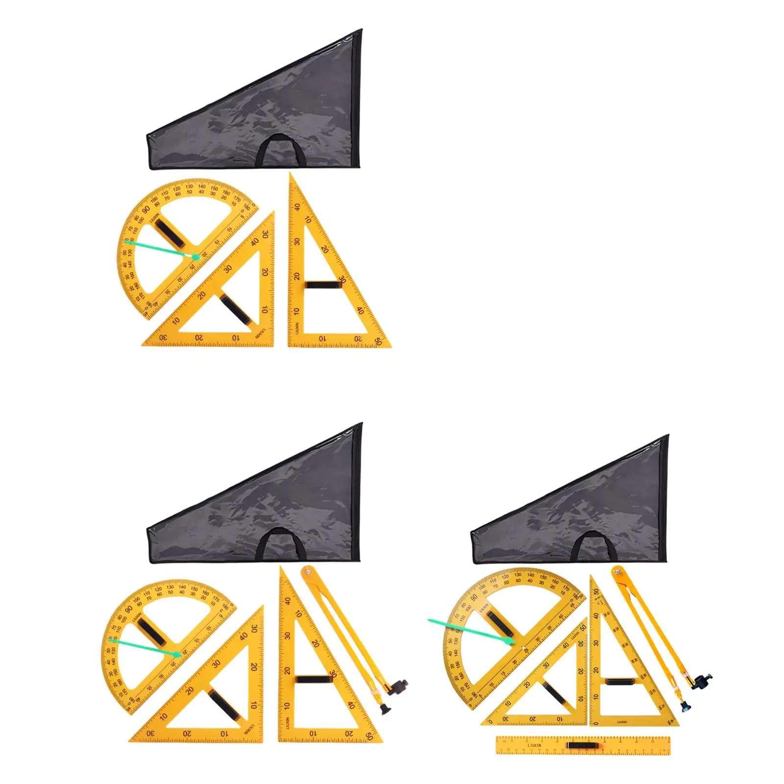 1x 45 triangles, 1x triangle de 60 degrés, 1x rapporteur, 1x sac de rangement