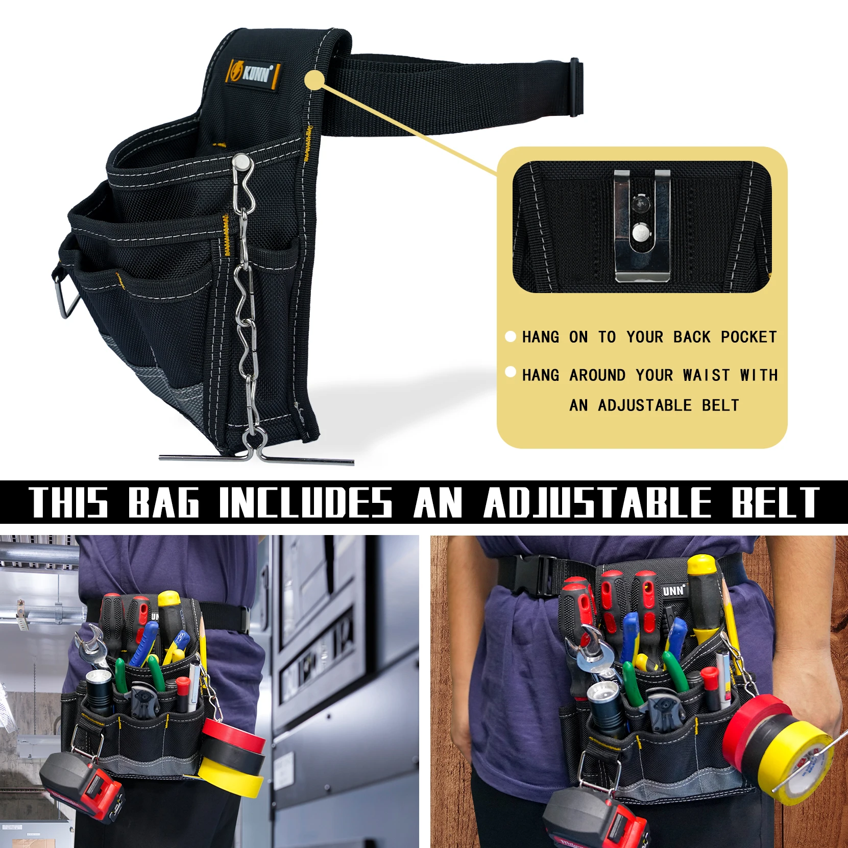 Pochette à outils pour électricien KUNN, pochettes à outils durables 1680D avec clip de ceinture, pochette pour électricien professionnel pour commerçant de maintenance