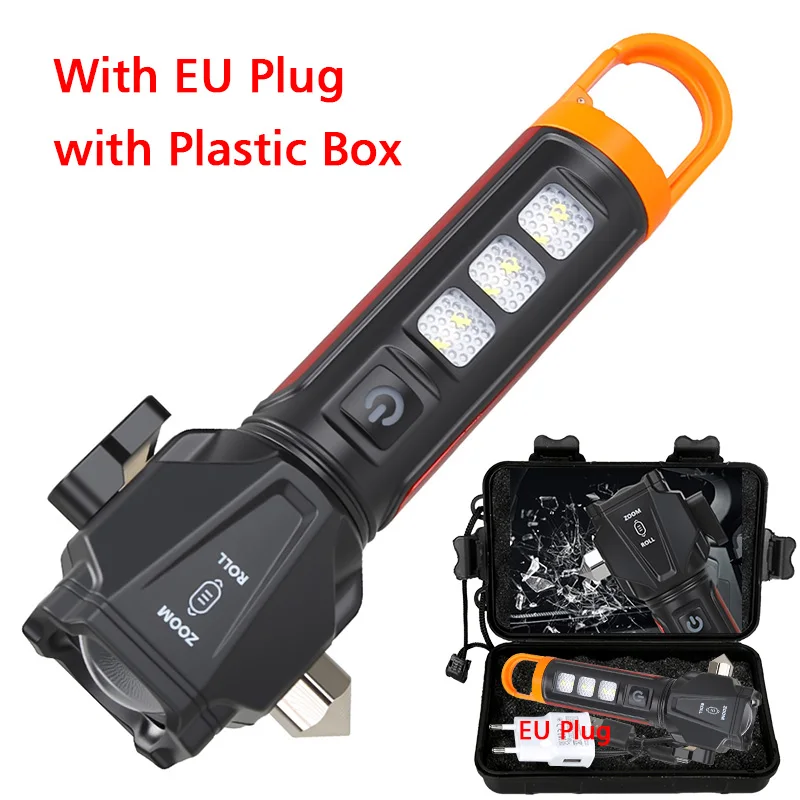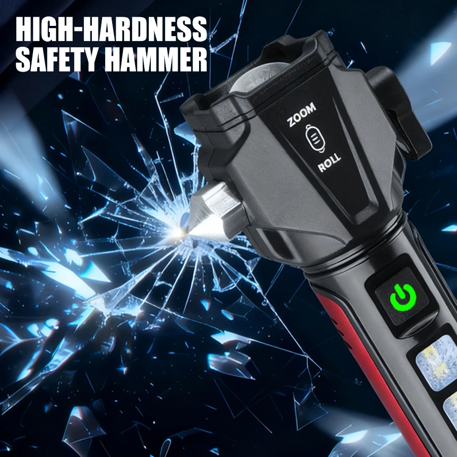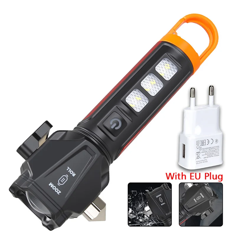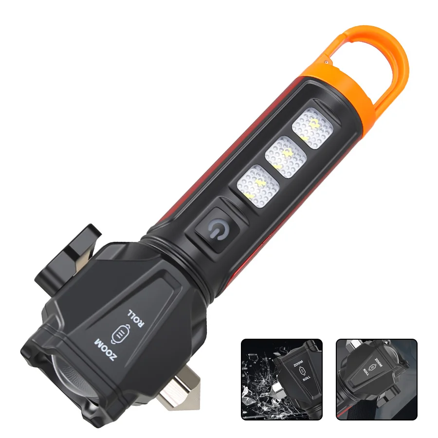 Lampe de poche zoom multifonctionnelle-double source de lumière, chargement de type C, marteau et coupeur de sécurité intégrés, portable et étanche