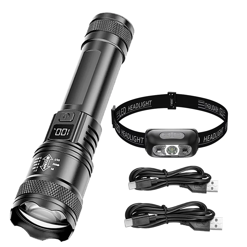 Lampes de poche LED haute puissance 2000LM, torche tactique avec affichage, chargeur USB, Camping, pêche, lanterne à Zoom d'urgence