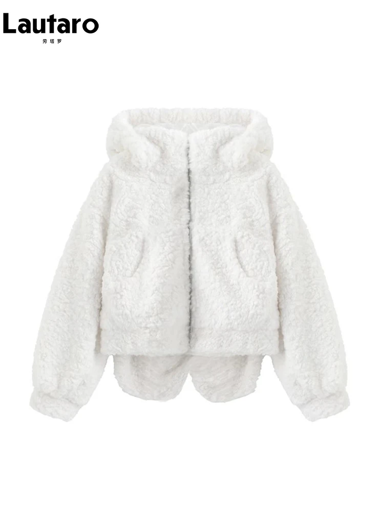 Lautaro automne hiver doux mignon belle chaud doux blanc court fausse fourrure manteau femmes avec oreilles de lapin moelleux veste à capuche 2023