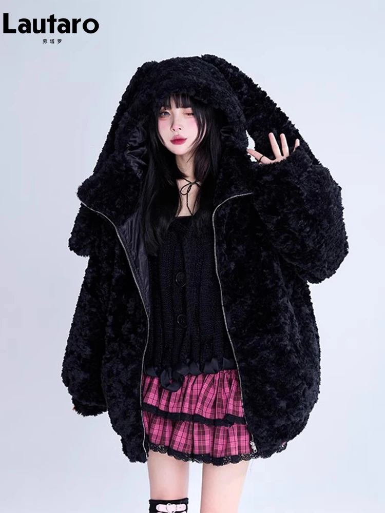 Lautaro-Manteau en fausse fourrure avec oreilles de lapin pour femme, veste chaude, sweat à capuche flou et moelleux, doux et mignon, belle optique, noir doux, automne et hiver 2023