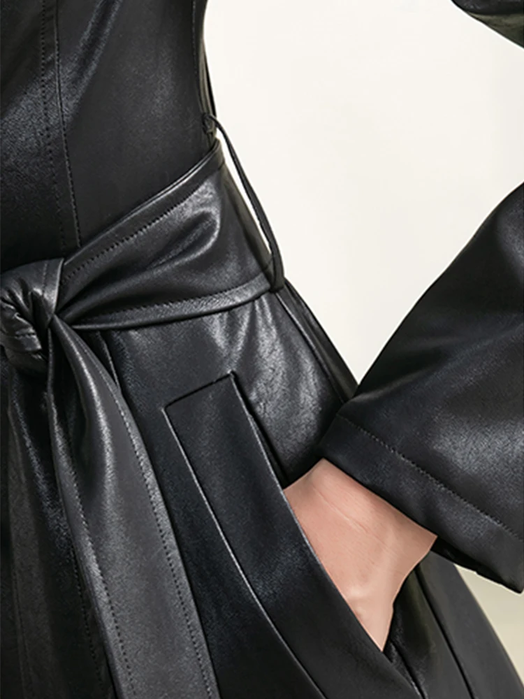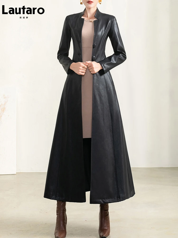 Lautaro – manteau Long en Faux cuir pour femme, noir, doux et imperméable, ceinture, manches longues, simple boutonnage, mode de luxe, printemps automne 2022