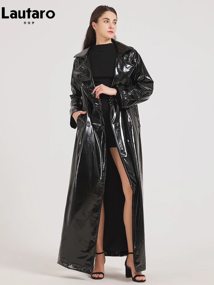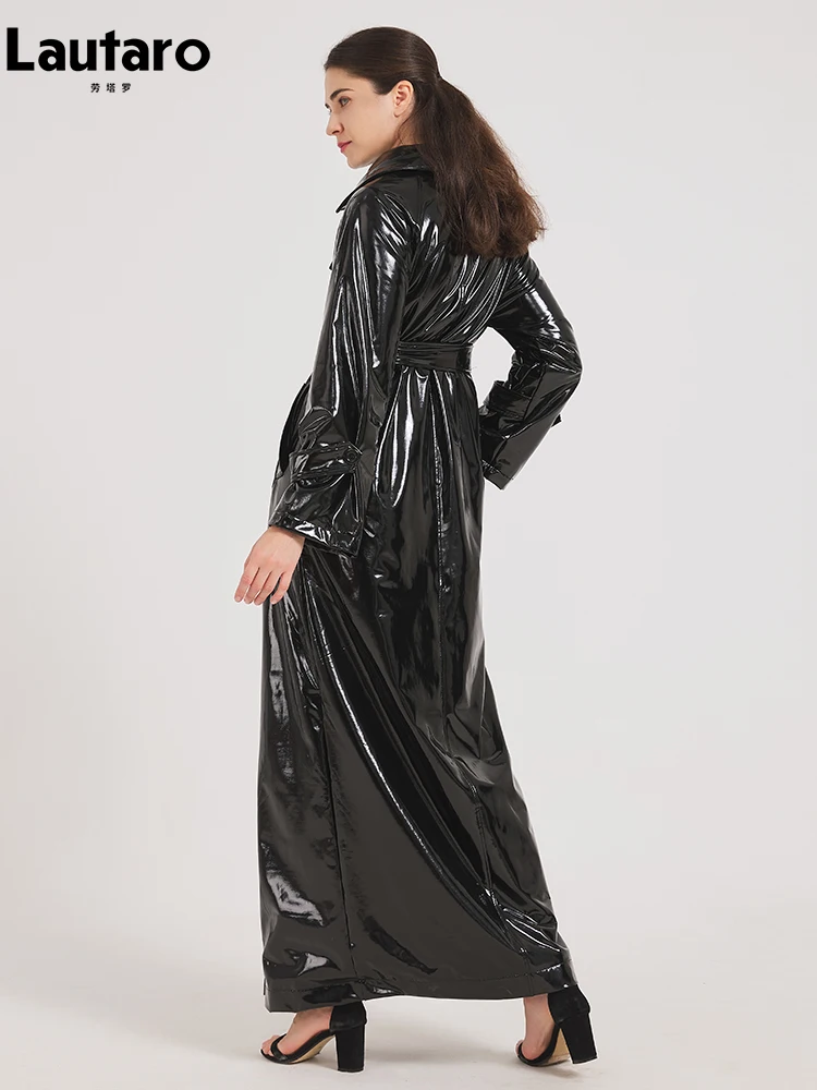 Lautaro printemps automne noir brillant réfléchissant doux en cuir verni Trench manteau pour les femmes de luxe concepteur longueur de plancher vêtements 2024