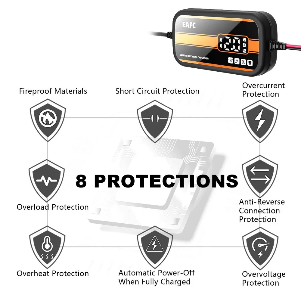 Fournit une sortie de 12V/2A avec prise en charge de plusieurs types de batteries, comme les batteries plomb-acide, AGM, gel et EFB.