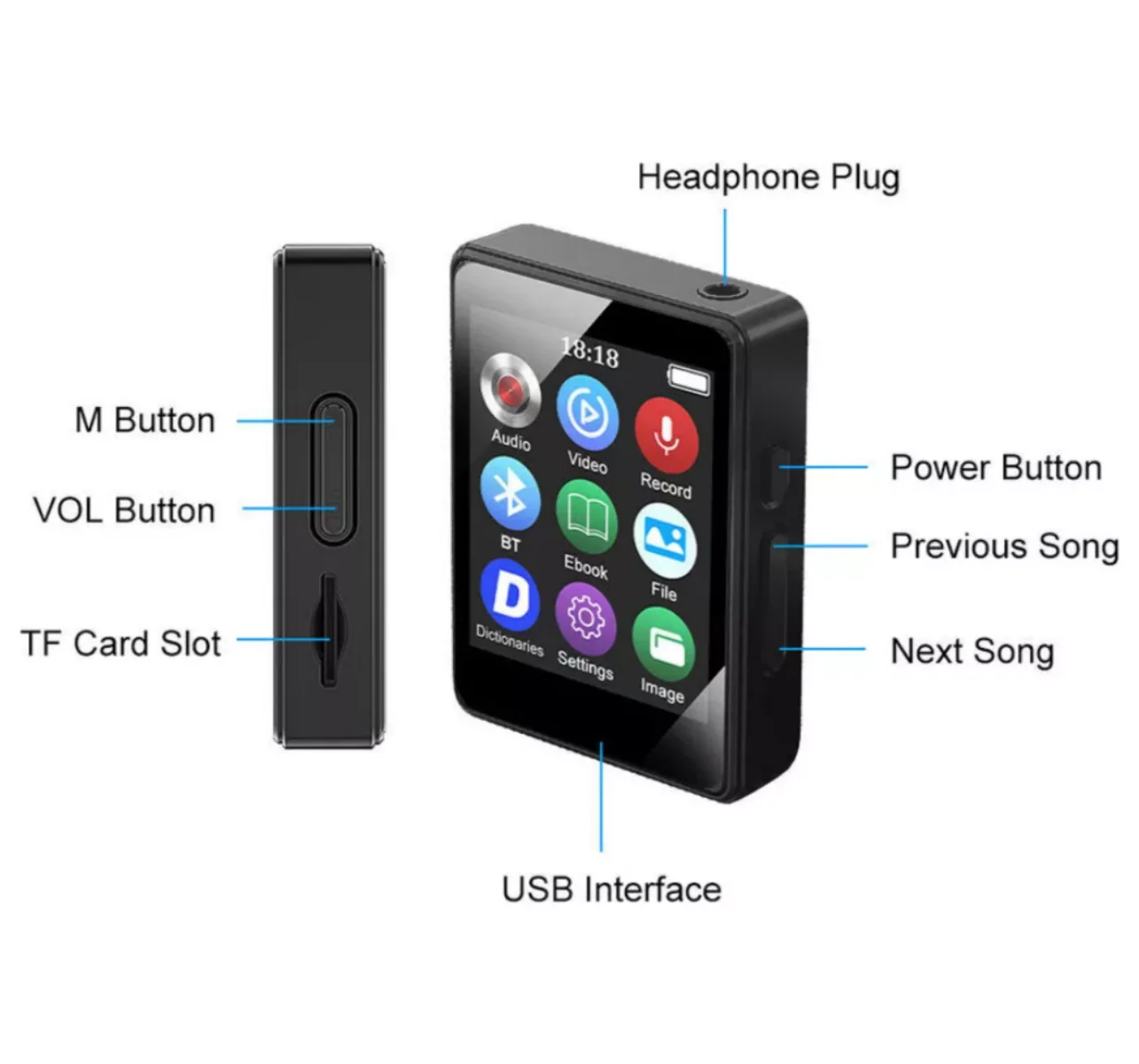 MP3 de style bouton plein écran : ce lecteur MP3 compatible Bluetooth dispose d'un 1.cran TFT de 8 pouces avec affichage haute définition.Sa taille mini et ses boutons latéraux physiques le rendent facile à utiliser, offrant un retour de clic clair et une expérience plus conviviale.Particulièrement adapté aux personnes âgées et aux enfants.