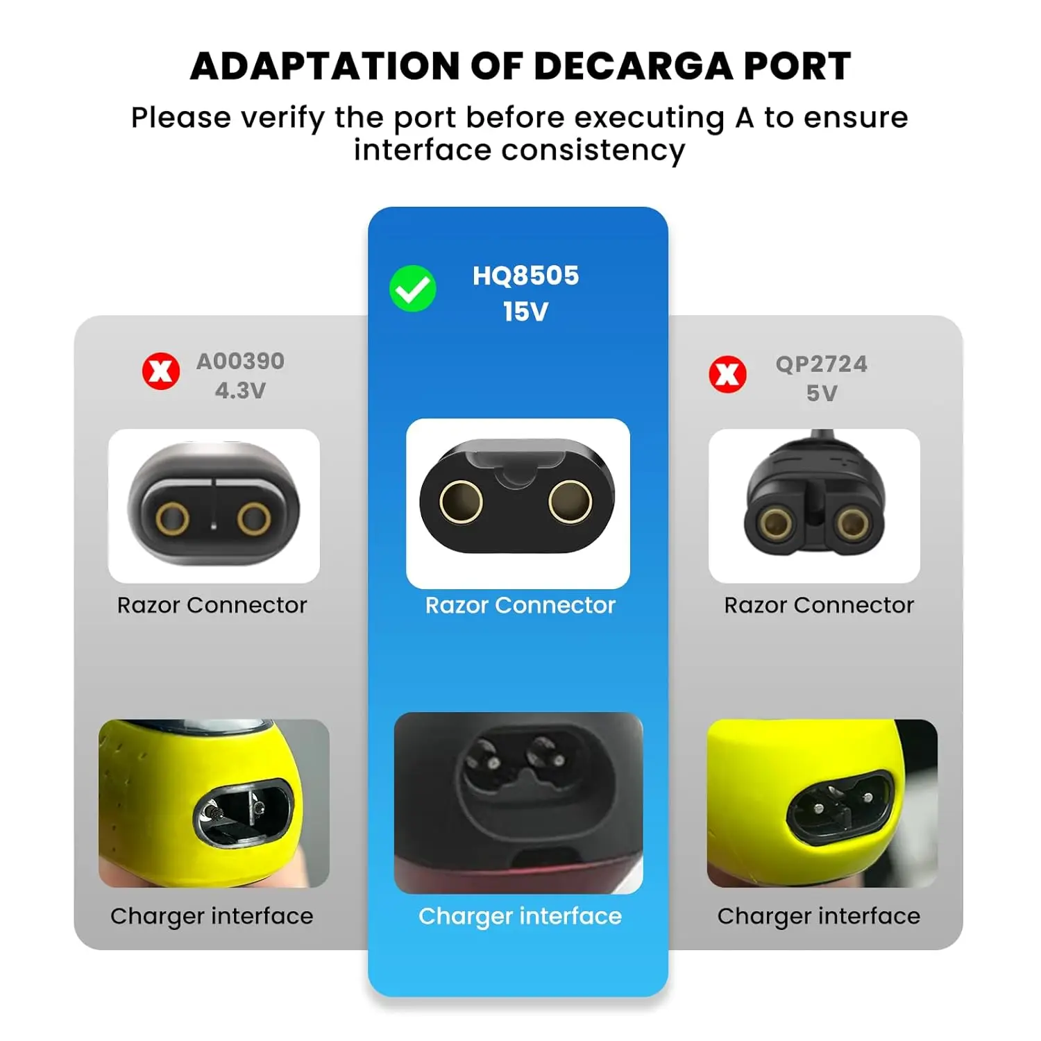 [Achat correct]Philip dispose d'une variété de tensions de charge et de ports de charge de formes différentes.Afin de ne pas affecter votre utilisation, veuillez confirmer les spécifications de tension de charge de votre rasoir et vous référer à nos photos avant d'acheter.Ce produit ne convient que pour15V.Si vous ne pouvez pas confirmer, veuillez nous contacter.