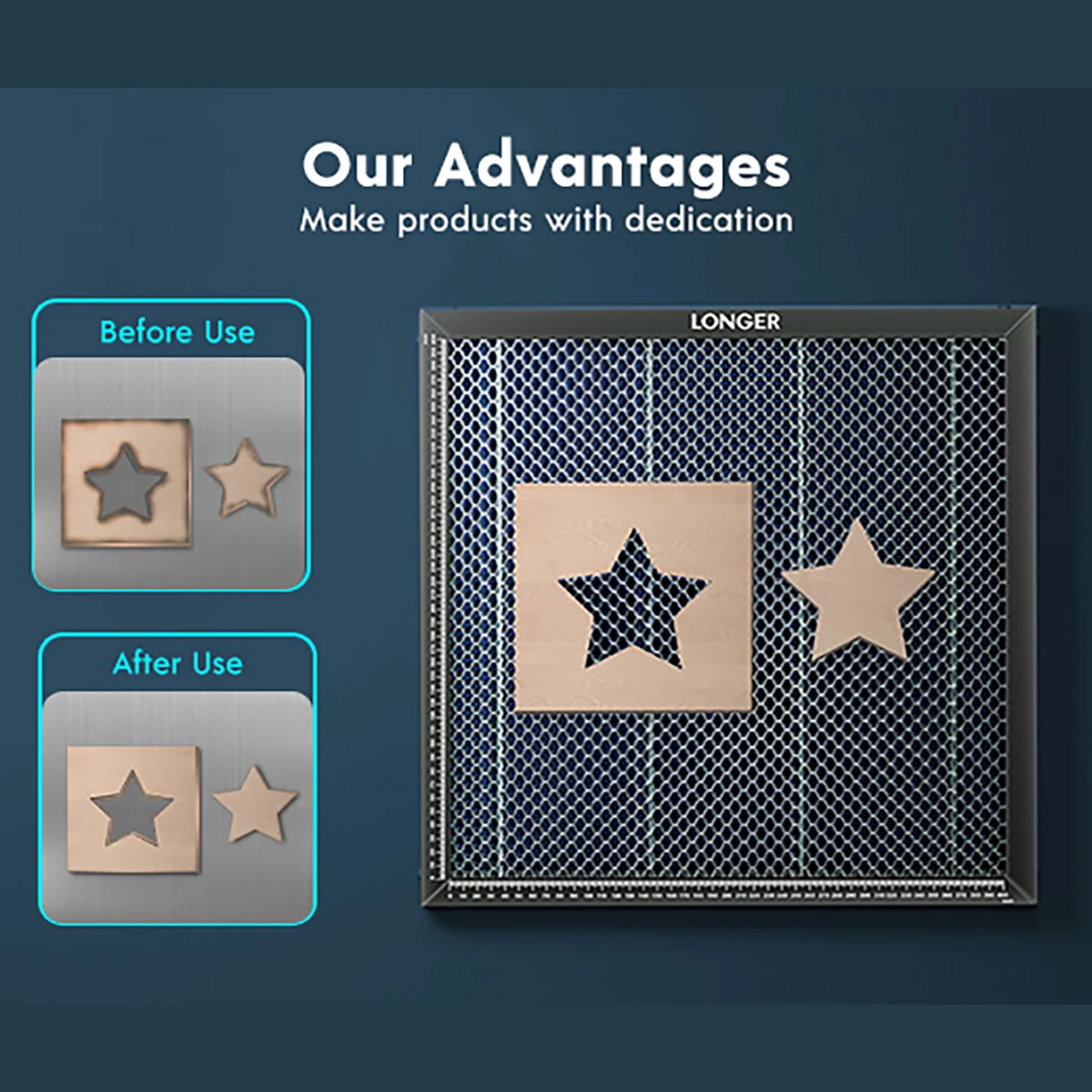 🔝Gravure à haute efficacité : le panneau en nid d'abeille de grande taille est de 500 x 500 mm / 400 x 400 mm / 300 x 200 mm (facultatif), qui peut couper du bois, de l'acrylique et d'autres matériaux, les bords du bois sont soignés et propres, et la taille de l'ouverture de 9 mm peut être disposée plus efficacement pendant le processus de gravure Smoke, aide à obtenir un meilleur effet de gravure.