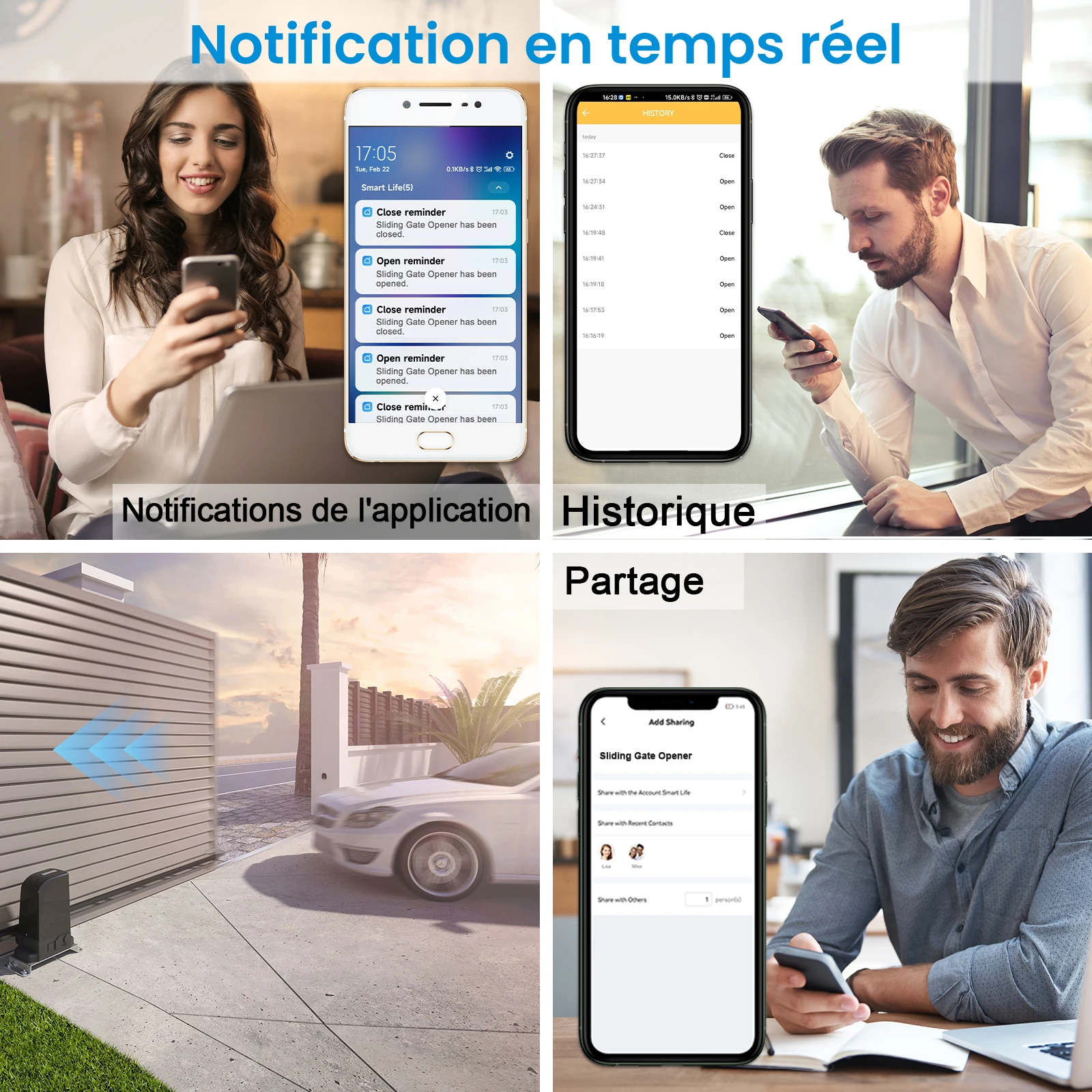 - Où que vous soyez, vous recevrez des notifications d'application lorsque la porte coulissante est ouverte/fermée.
