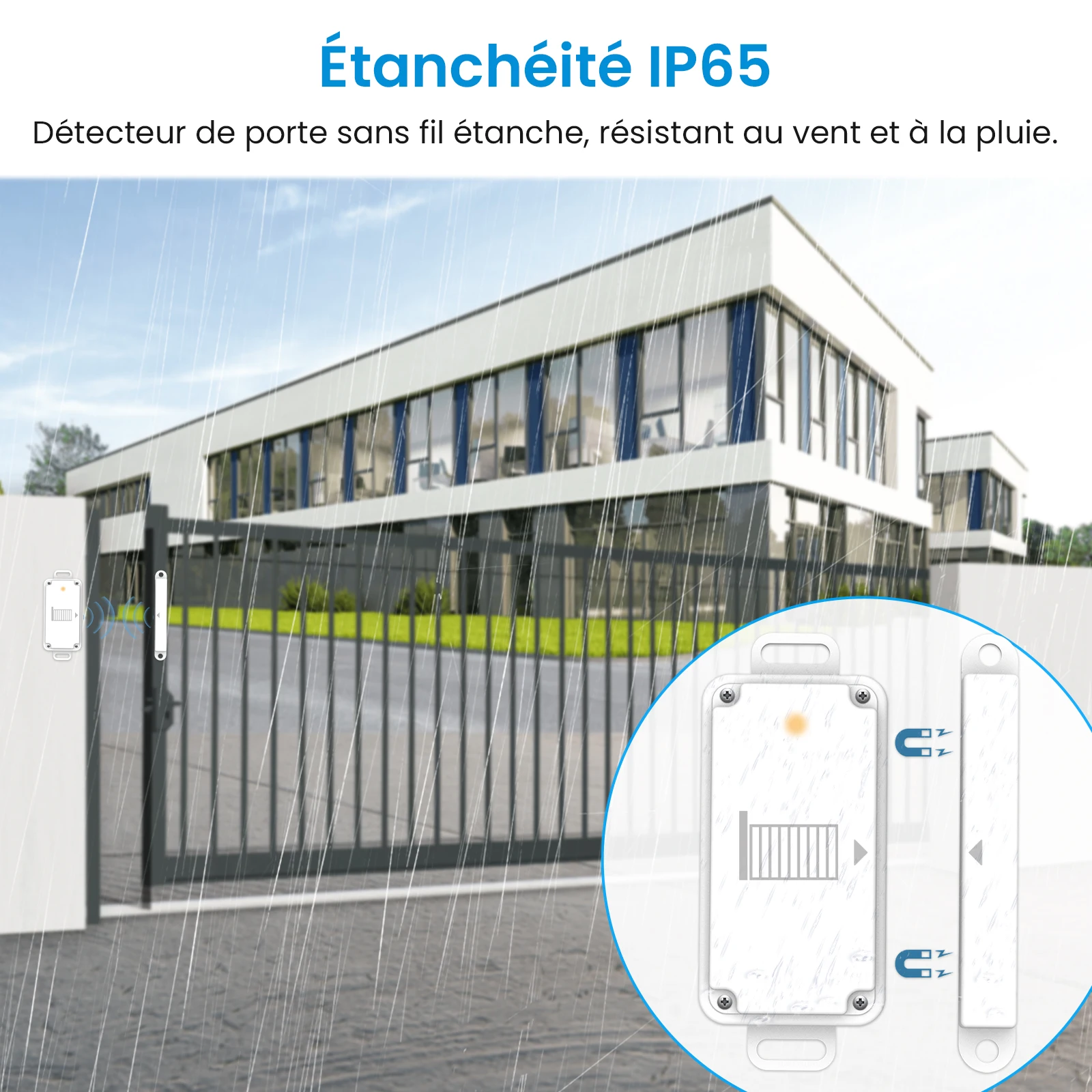 - Capteur de porte étanche sans fil : niveau d'étanchéité IP65, aucun câblage requis, facile à gérer avec le vent extérieur et la pluie.