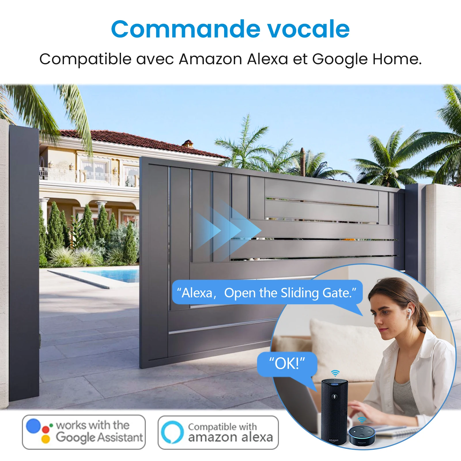 - Commande vocale : compatible avec Amazon Alexa, Google Home.