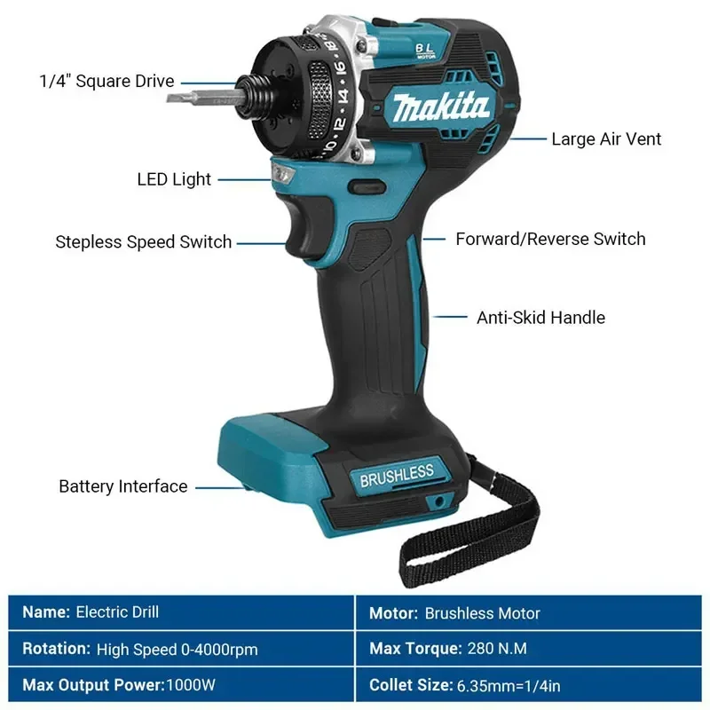 Tournevis électrique sans balais Makita 4000 tr/min, perceuse électrique à percussion 3800 IPM 180 Nm pour batterie 18 V, idéal pour carrelage, métal et bois.