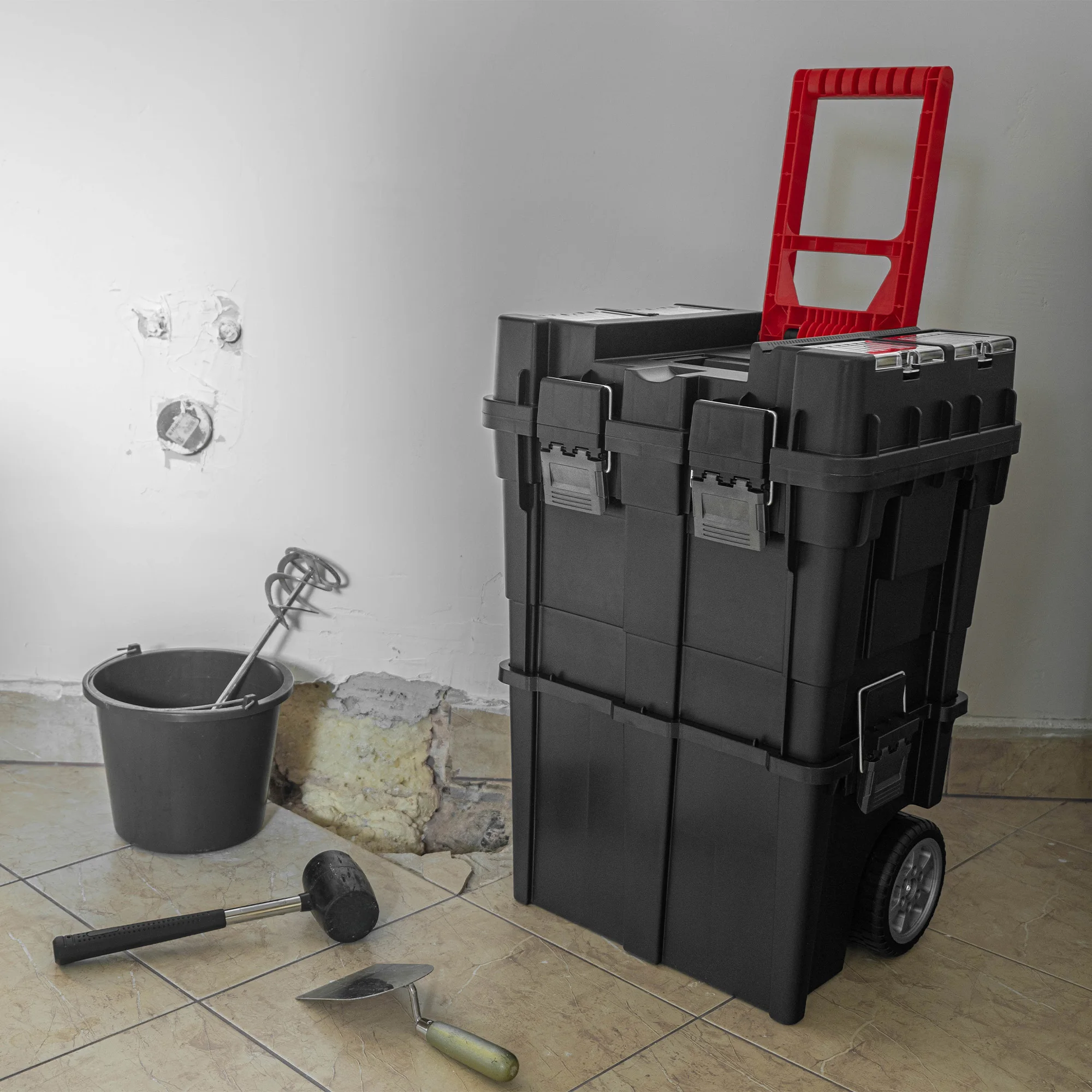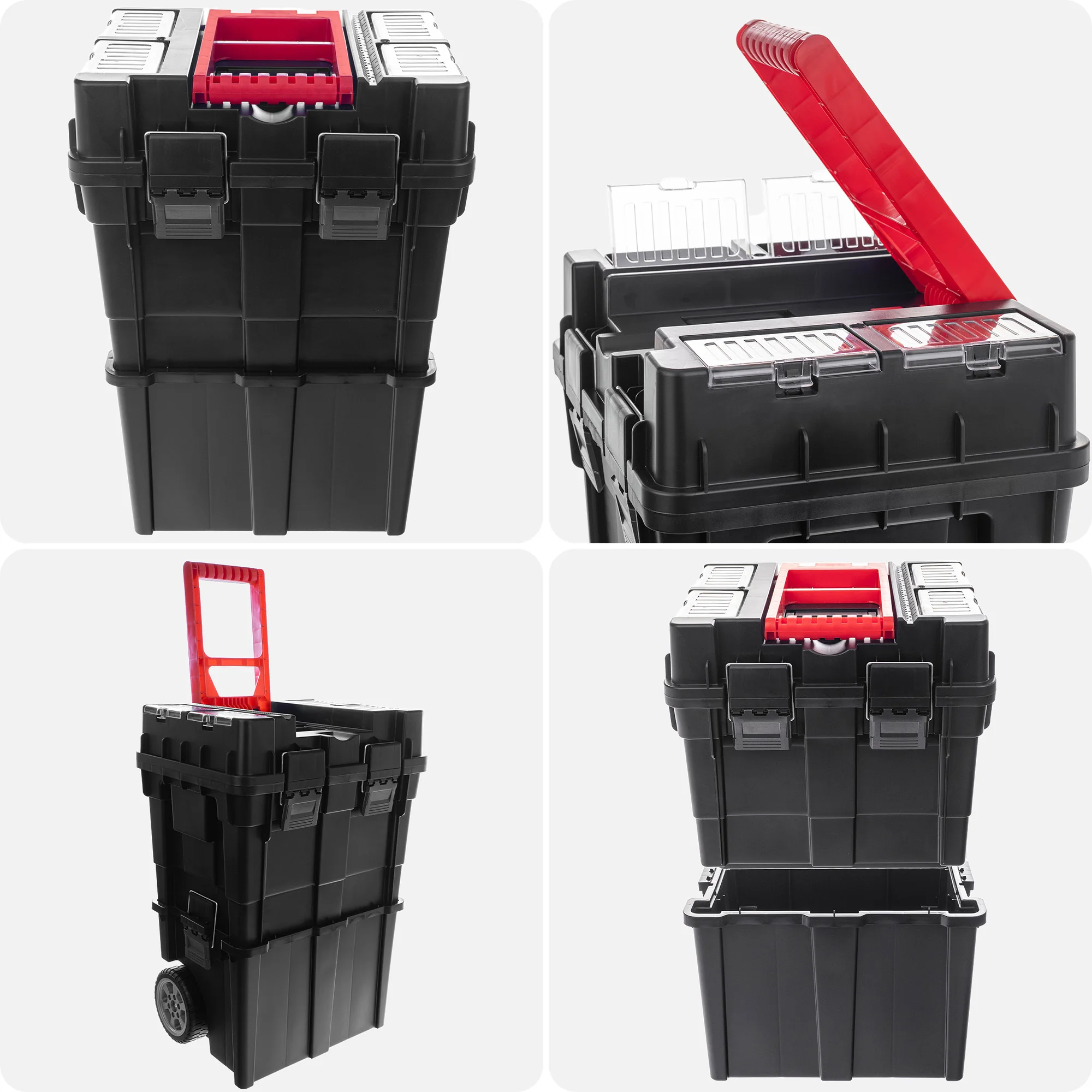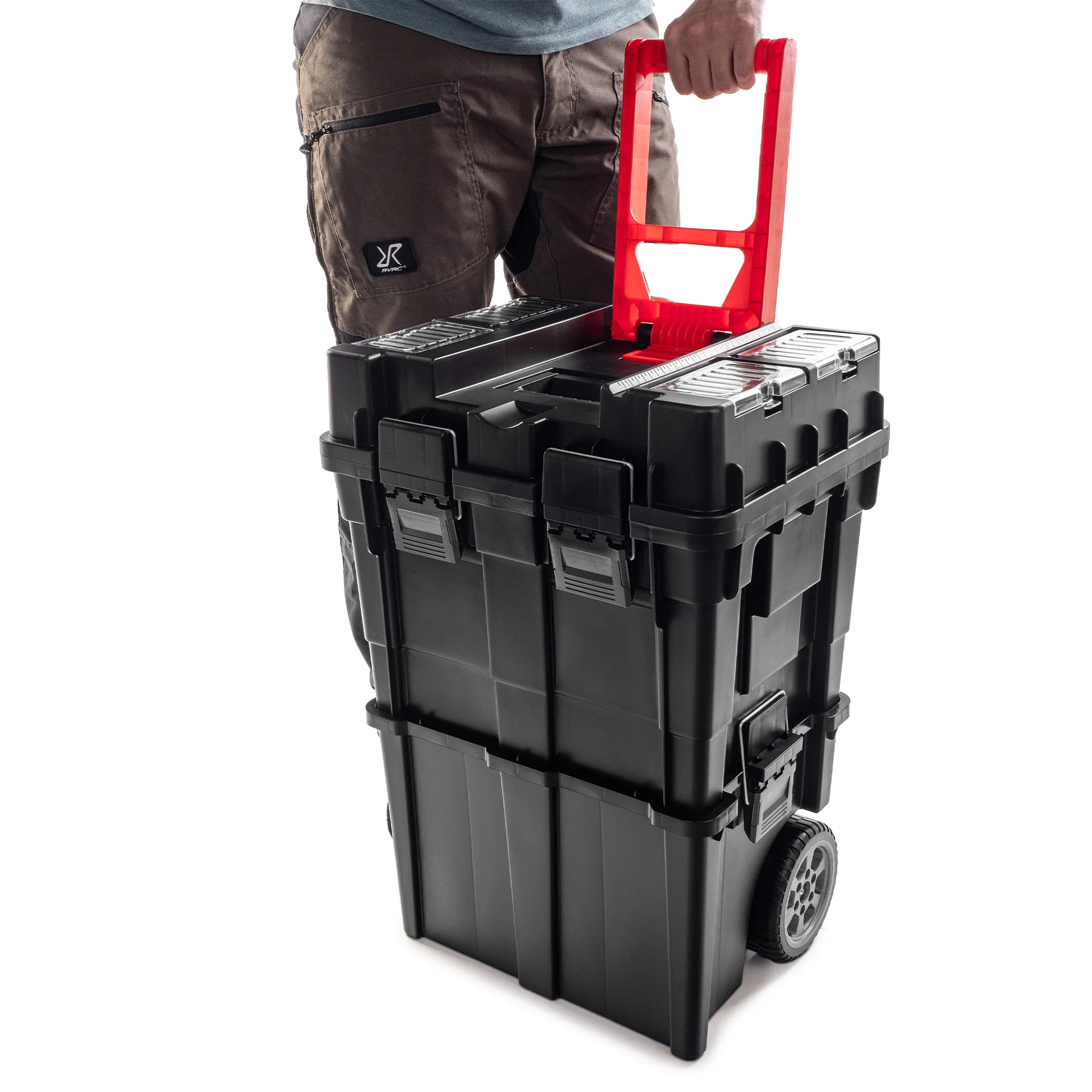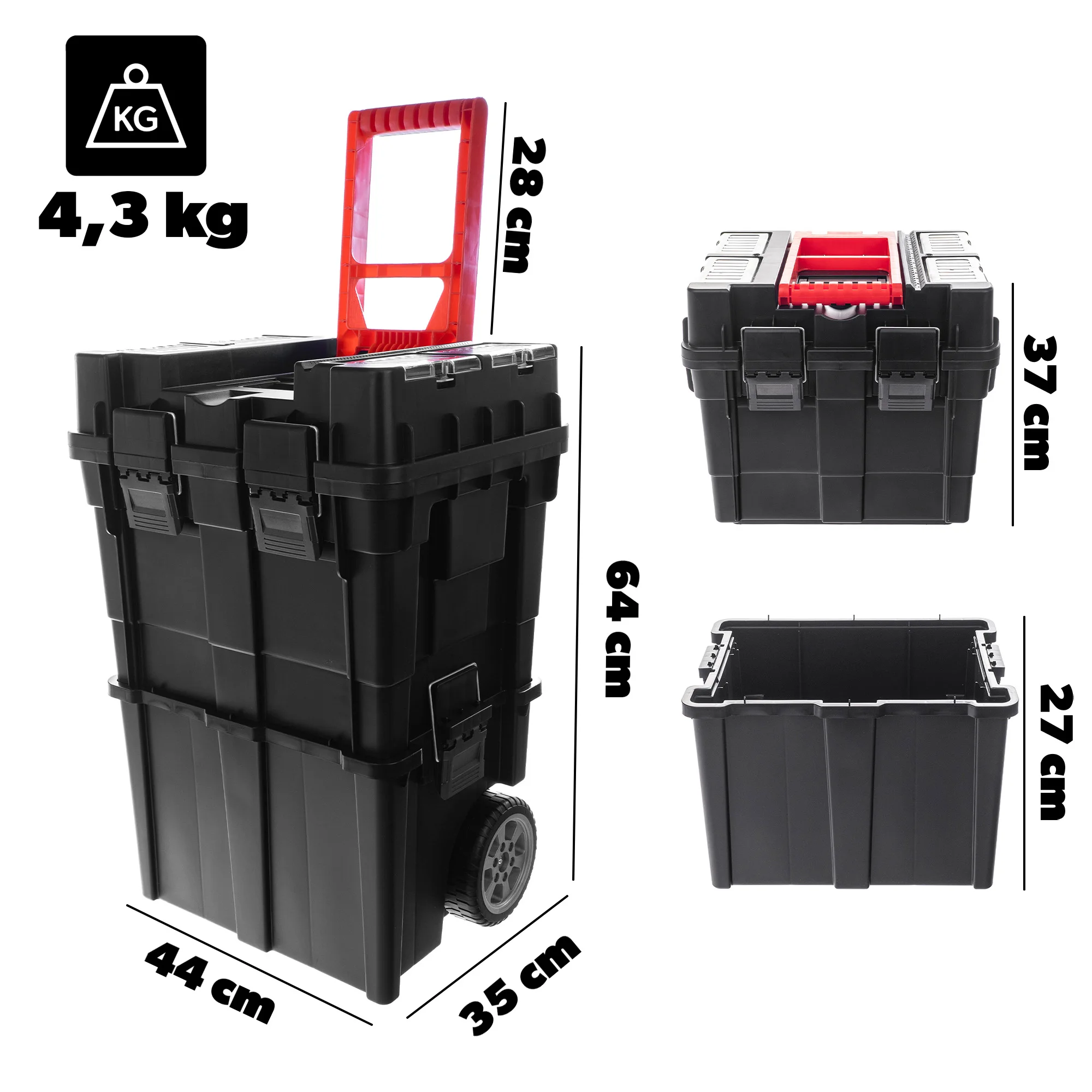 The box was designed for user convenience. One of the models has wheels, which significantly facilitates transport, especially when there are heavier tools inside. In other variants, comfortable handles were used, which make it easy to carry.
