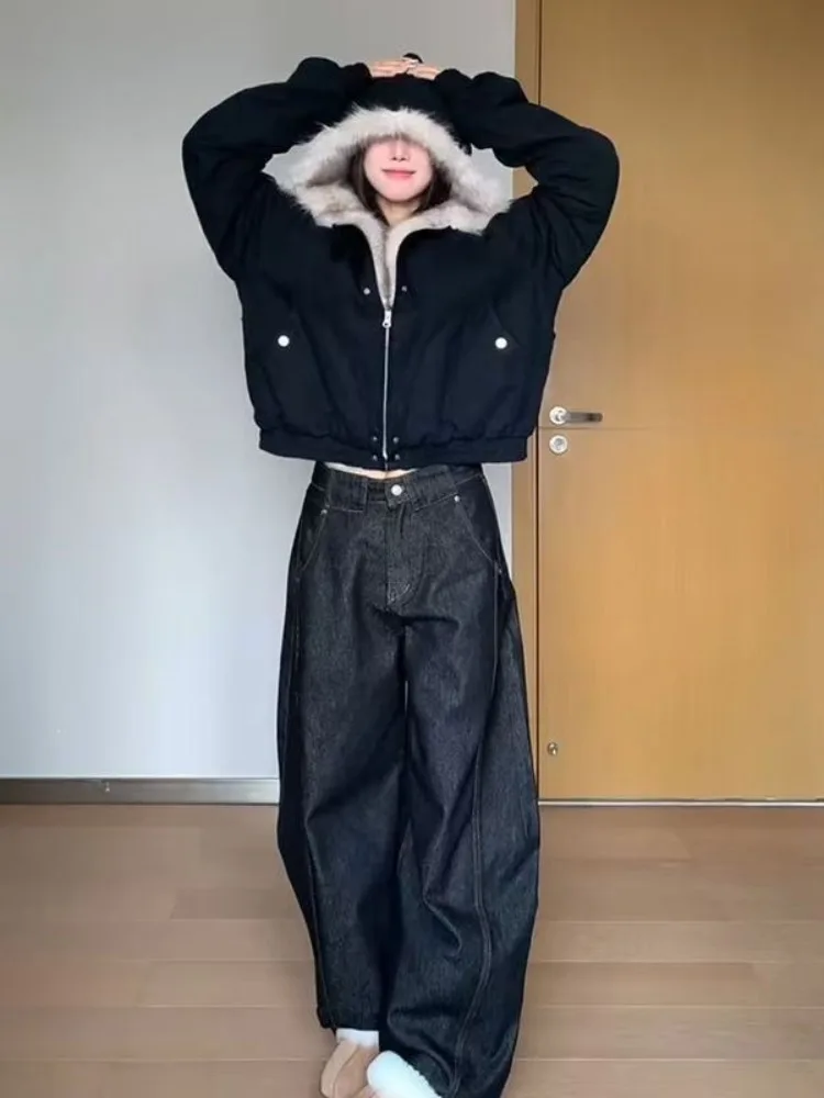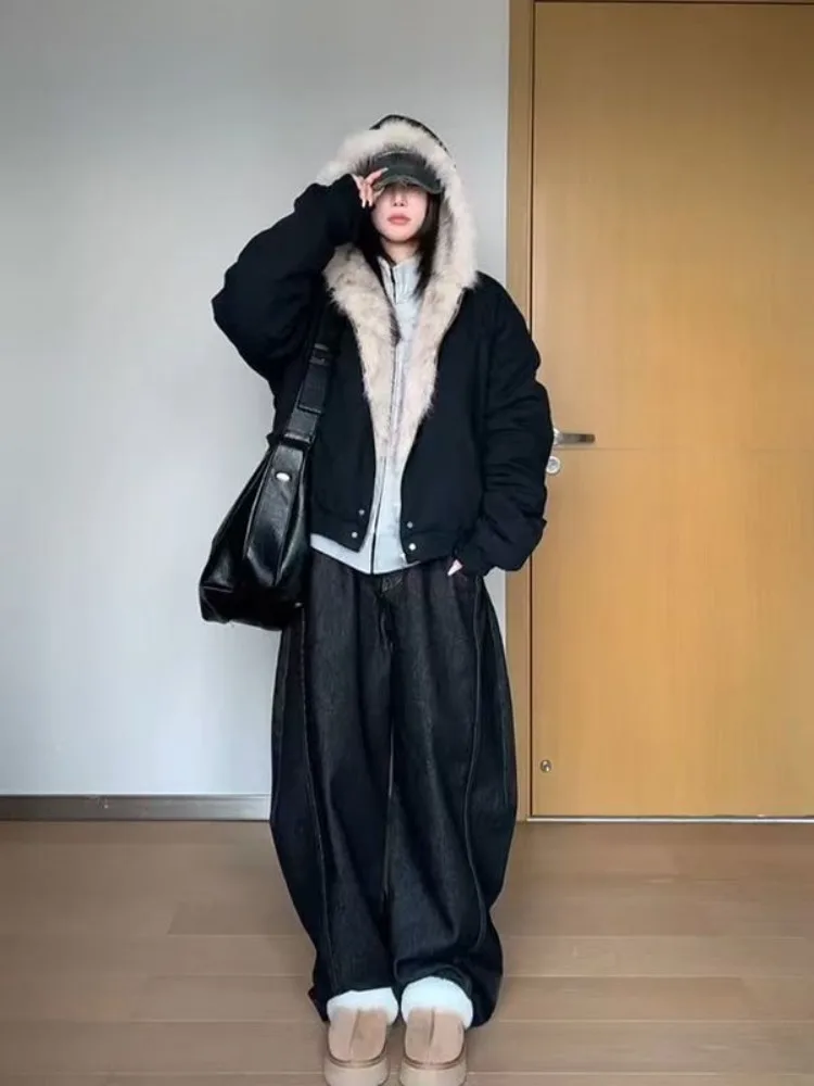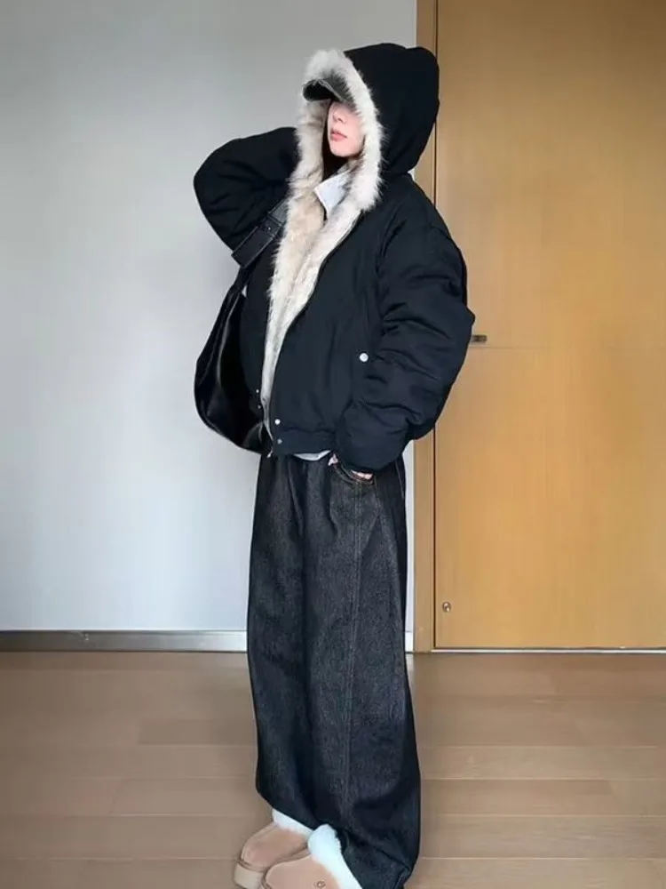 Manteau ample en fourrure pour femme, doublure élégante, col en fourrure Y2k, capuche épaisse, Parkas à la mode, vêtements d'extérieur décontractés, vestes rembourrées en coton, nouvelle collection automne