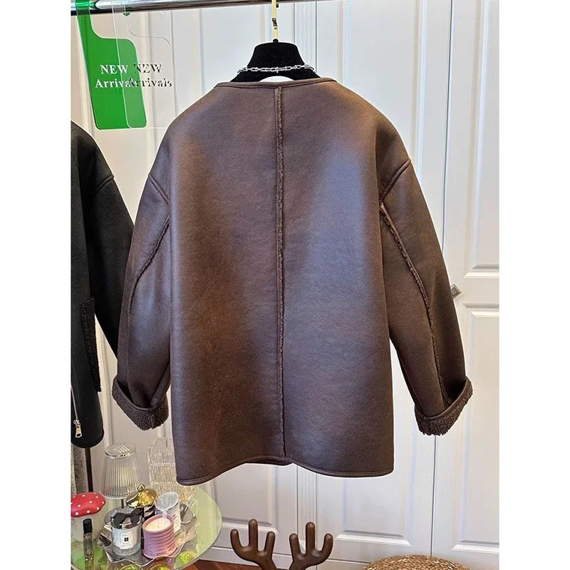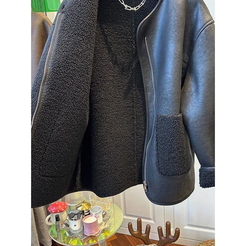Manteau en cuir à col rond pour femme, veste en cuir grande taille, fermeture éclair, coutures en fourrure, automne, hiver, 2024