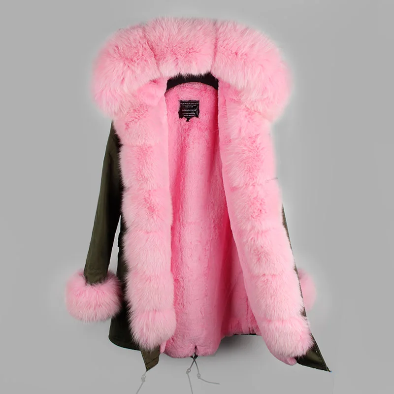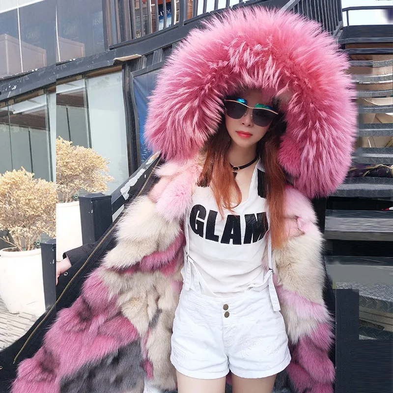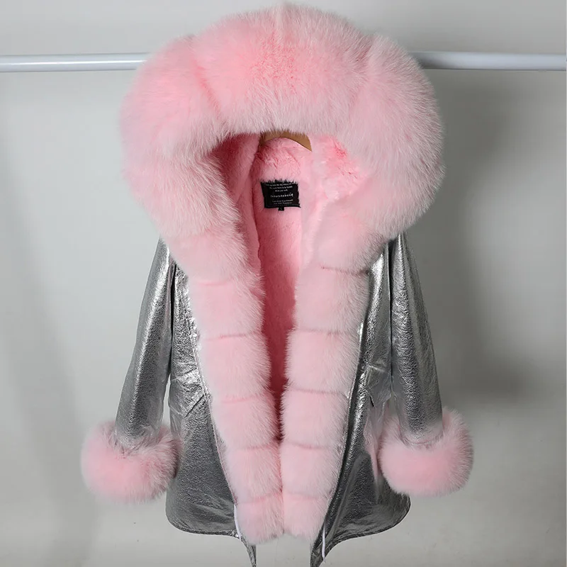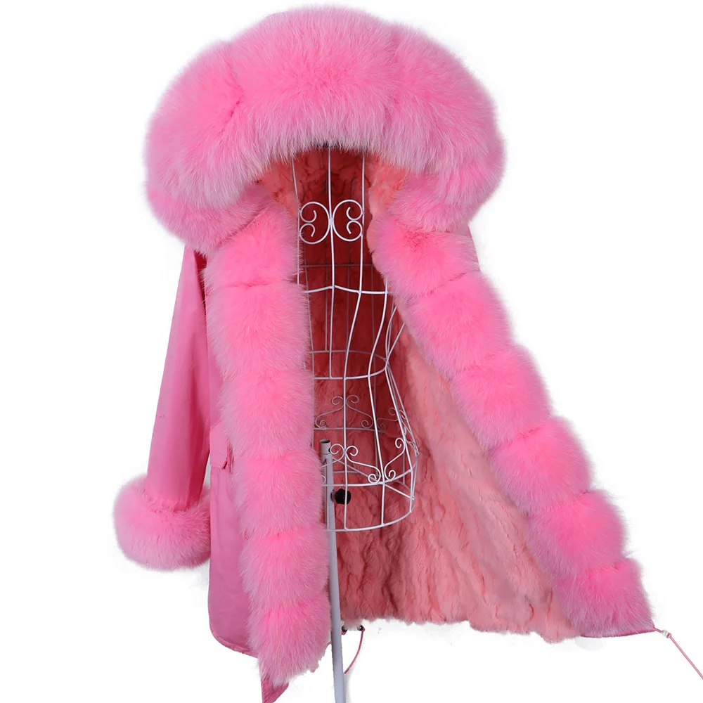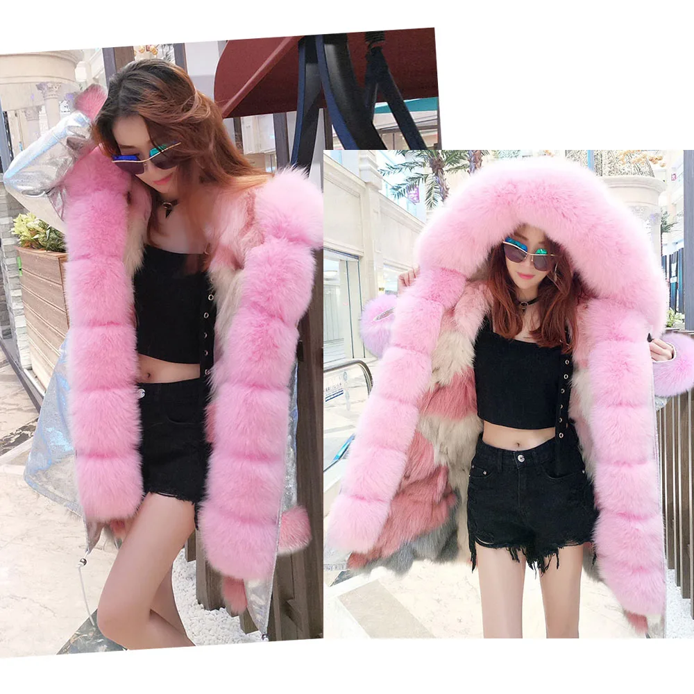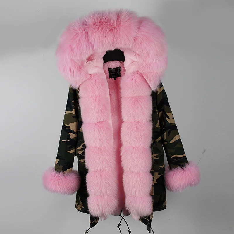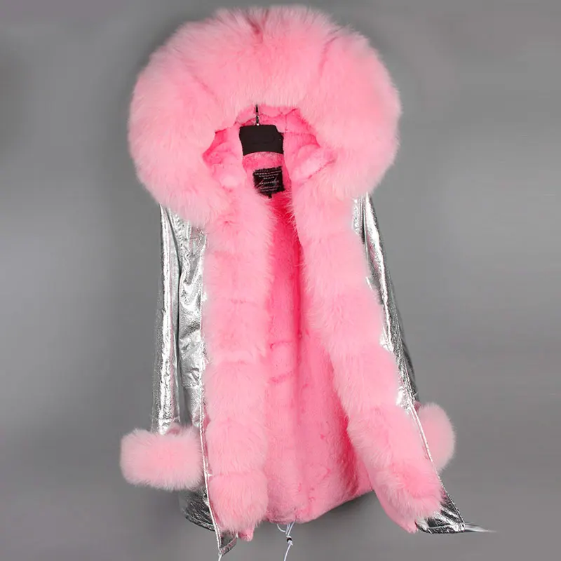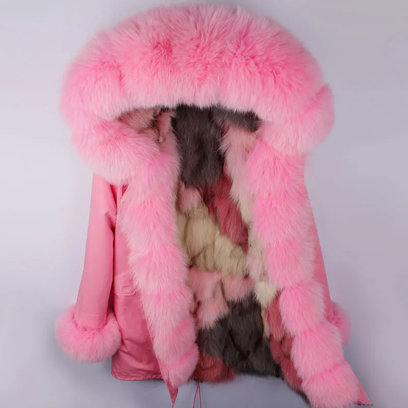 MAOMAOKONG-Veste d'hiver longue pour femme, Parkas optiques, Manteau à col en fourrure de renard véritable naturel, Vêtements à capuche roses, Vêtements pour femmes