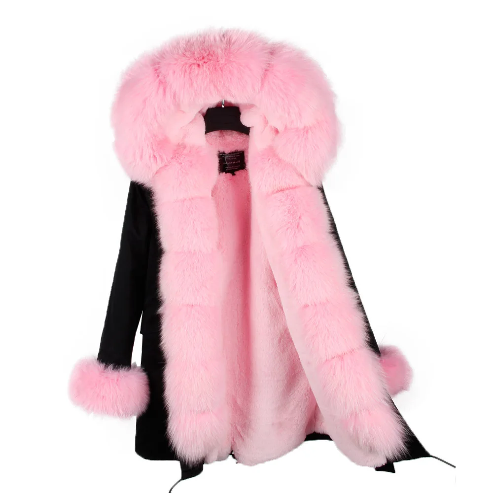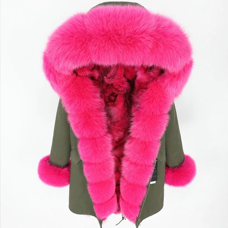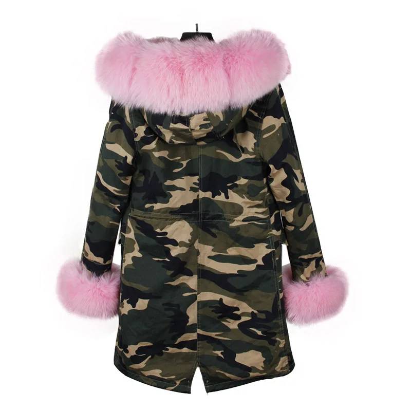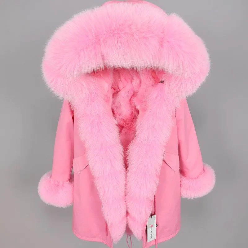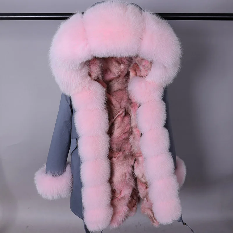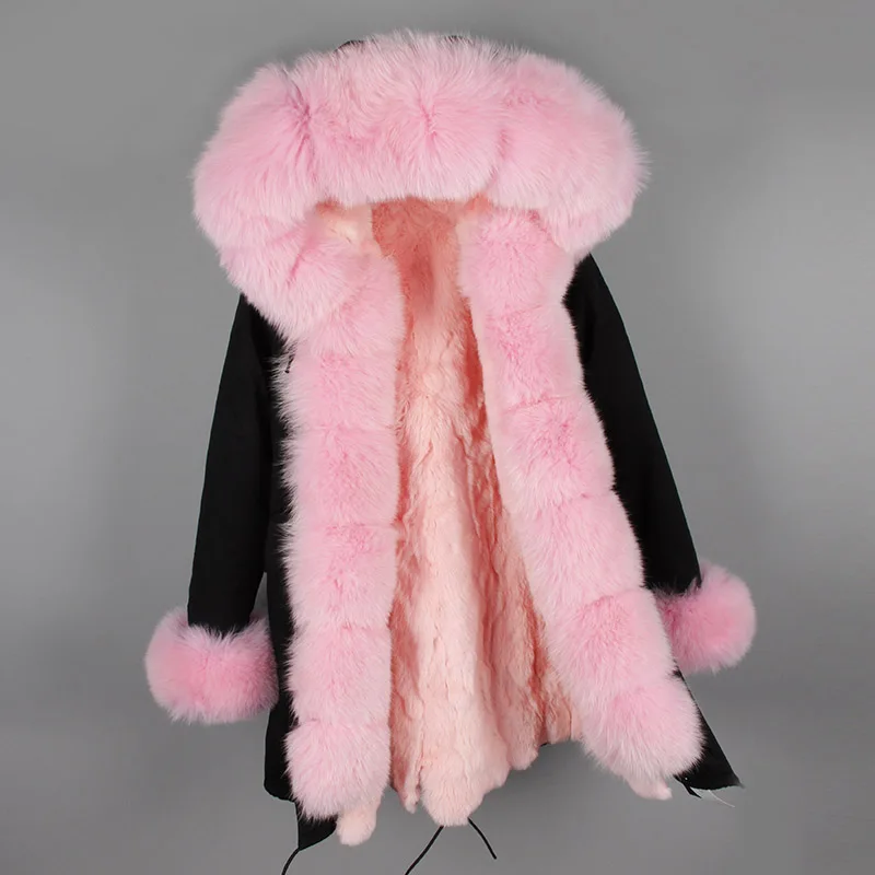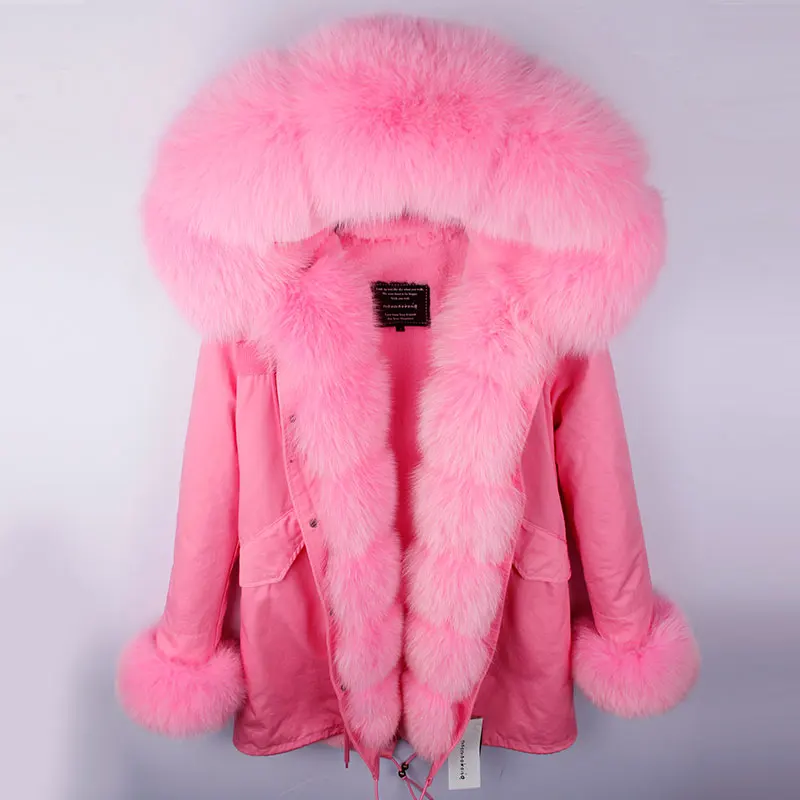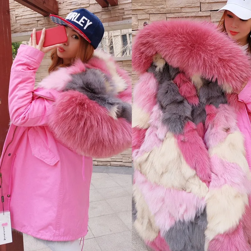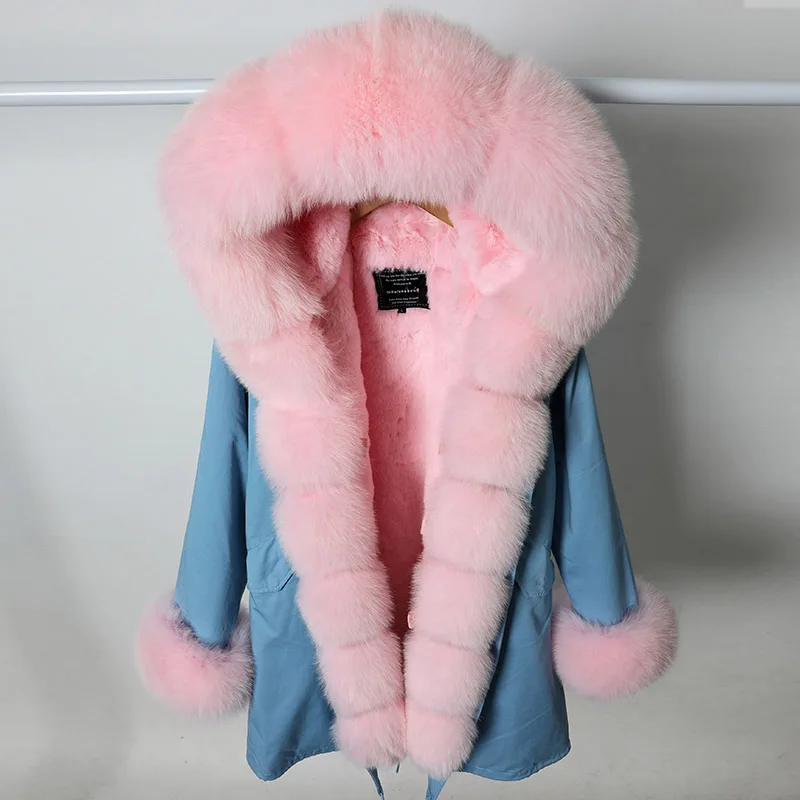 MAOMAOKONG-Veste d'hiver longue pour femme, Parkas optiques, Manteau à col en fourrure de renard véritable naturel, Vêtements à capuche roses, Vêtements pour femmes