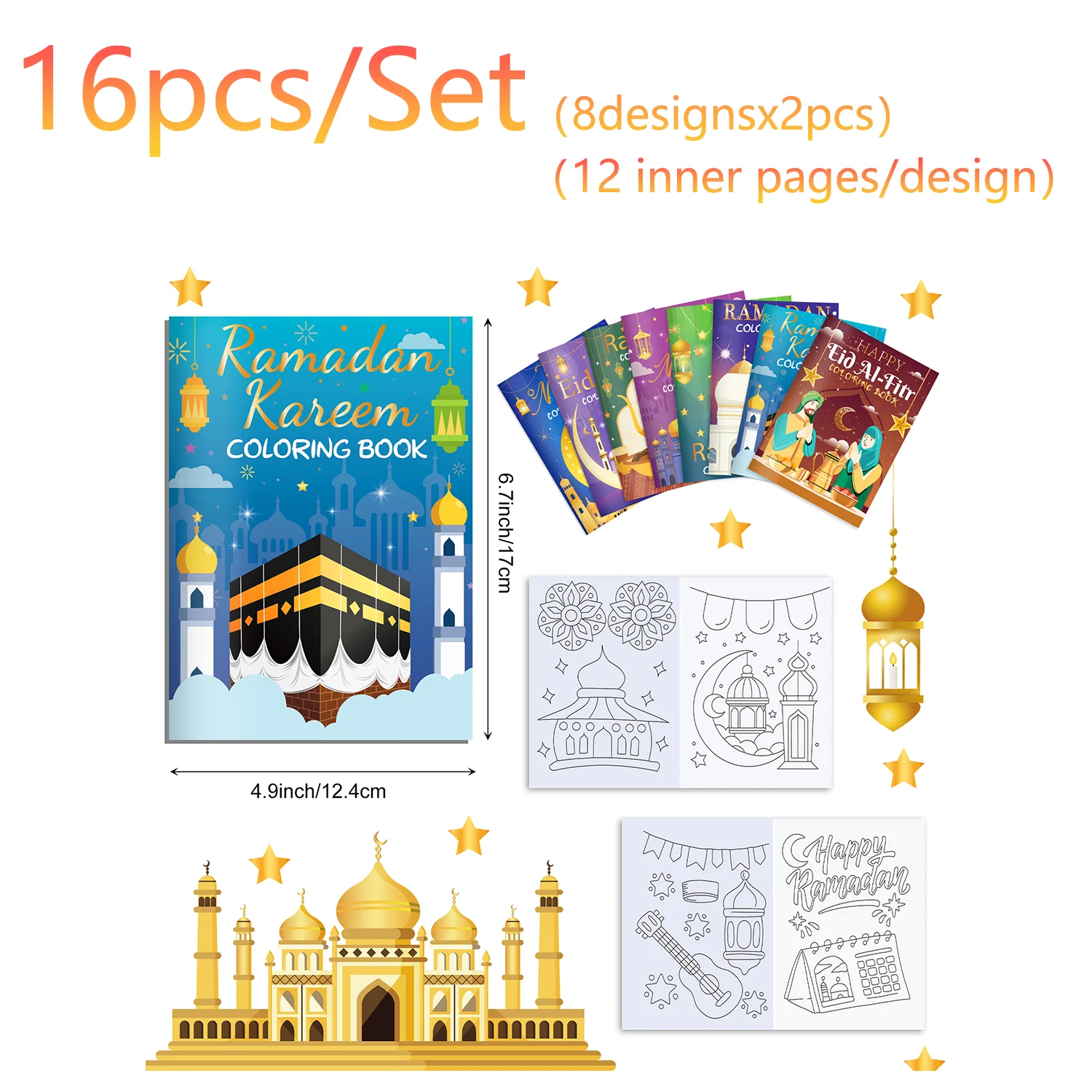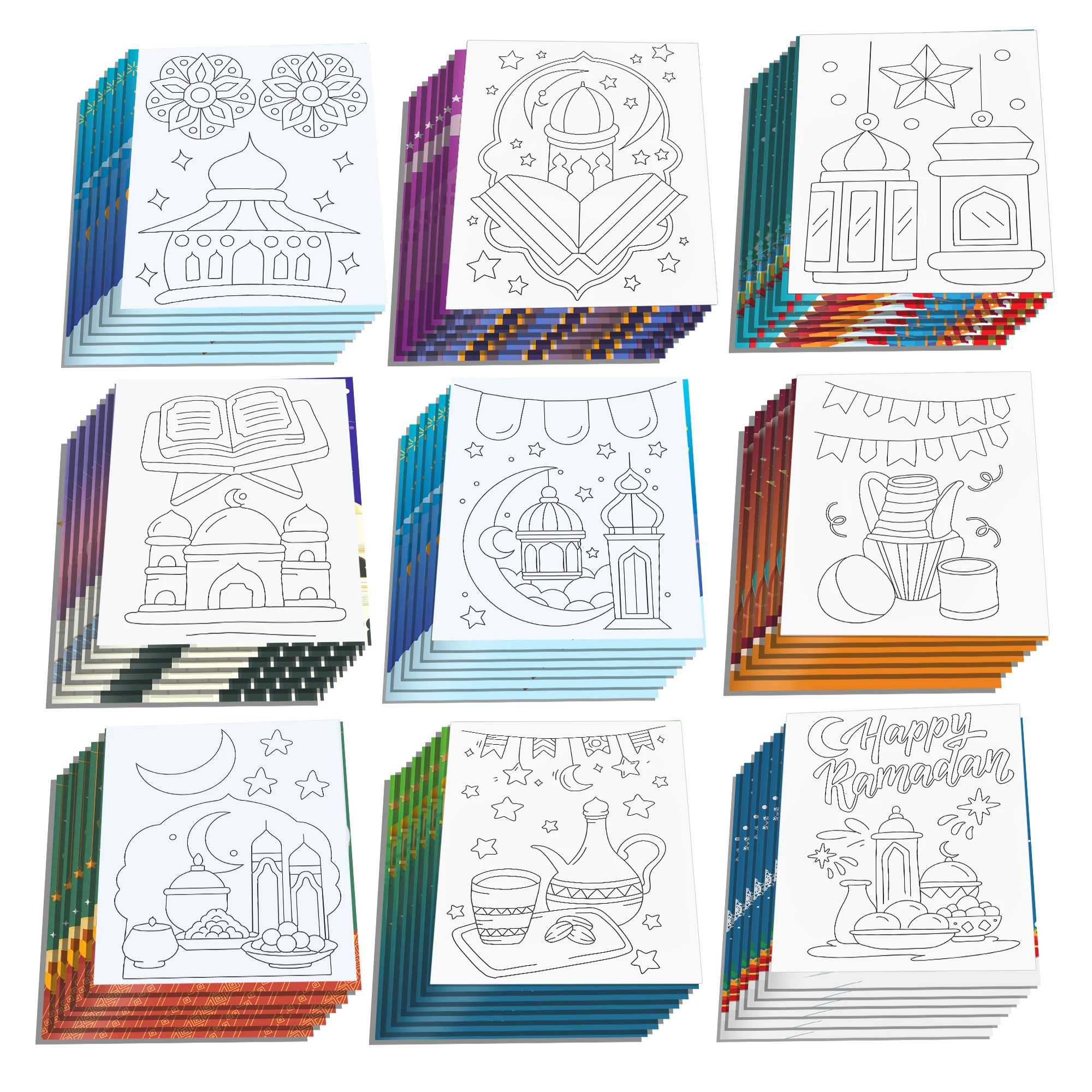 Détail du produit - Matériel : Papier - Taille : 17*12,4 cm/6,7*4,9 pouces - Emballage : 16 pièces/ensemble = 8 modèles * 2, 12 pages intérieures pour chaque modèle - Application : fête de l'Aid Mubarak, enseignement scolaire, cadeaux pour enfants, fête d'anniversaire, fête des enfants et célébration de festivals. - 100 % neuf et de haute qualité