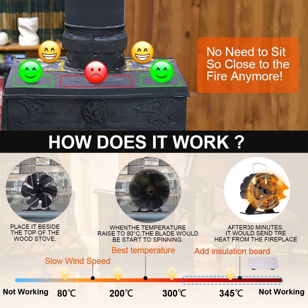Ce ventilateur de cheminée ne nécessite ni piles ni électricité et est alimenté en convertissant la chaleur en énergie, ce qui est respectueux de l'environnement et efficace.