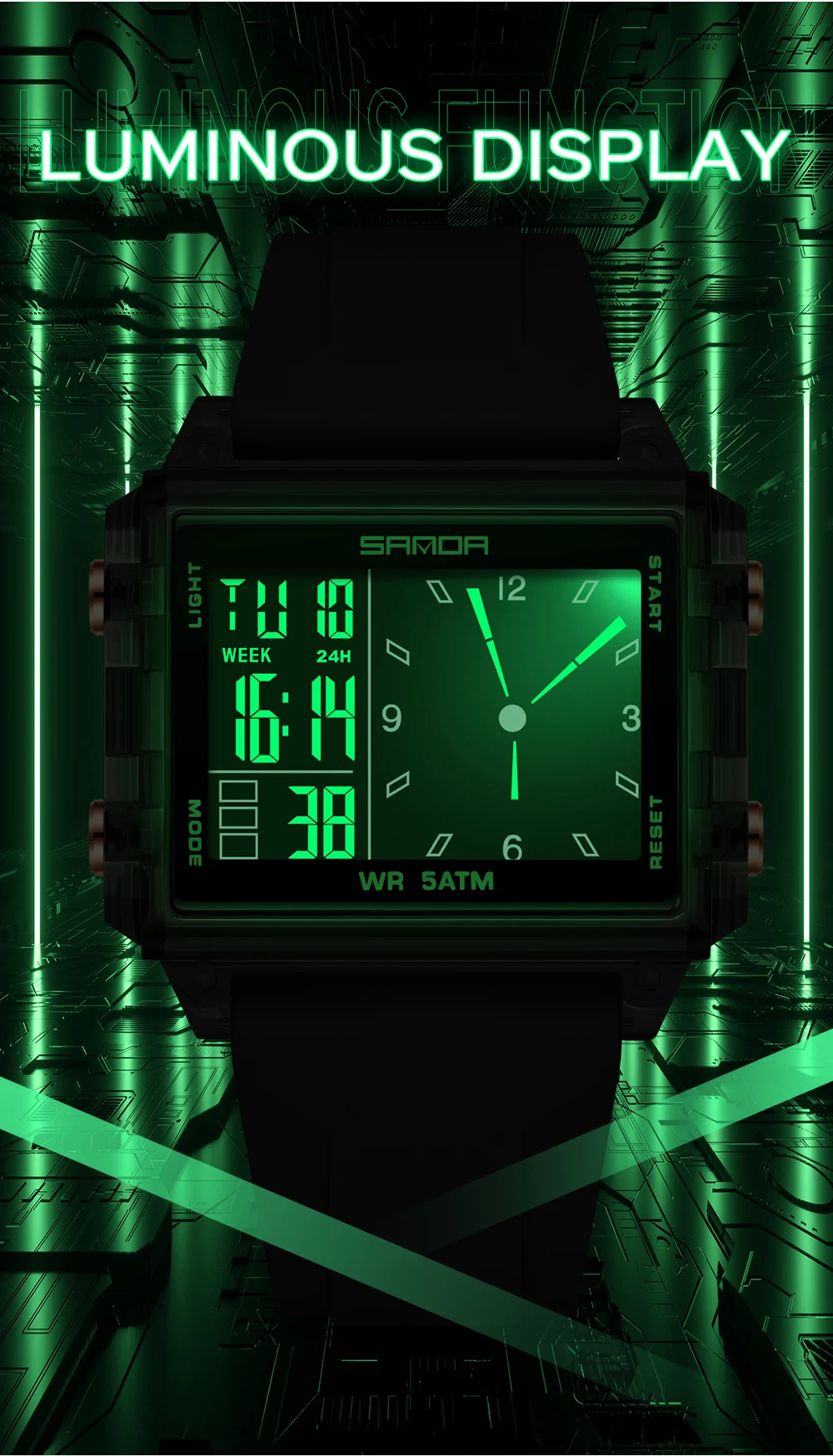 Lumineux, Rétroéclairage, Résistant aux chocs, Affichage LED, Répéteur, Chronographe, Calendrier complet, DIVERT, Alarme