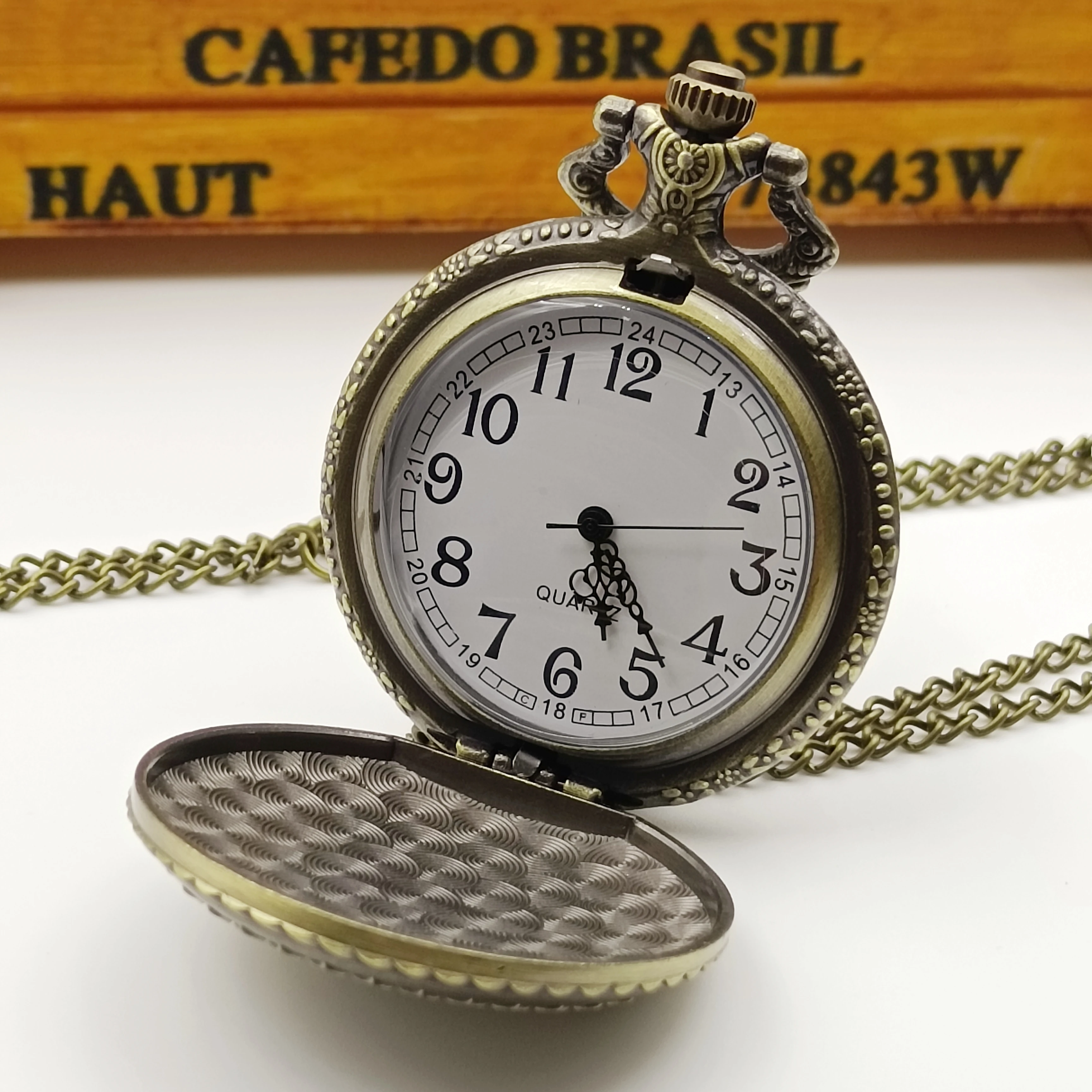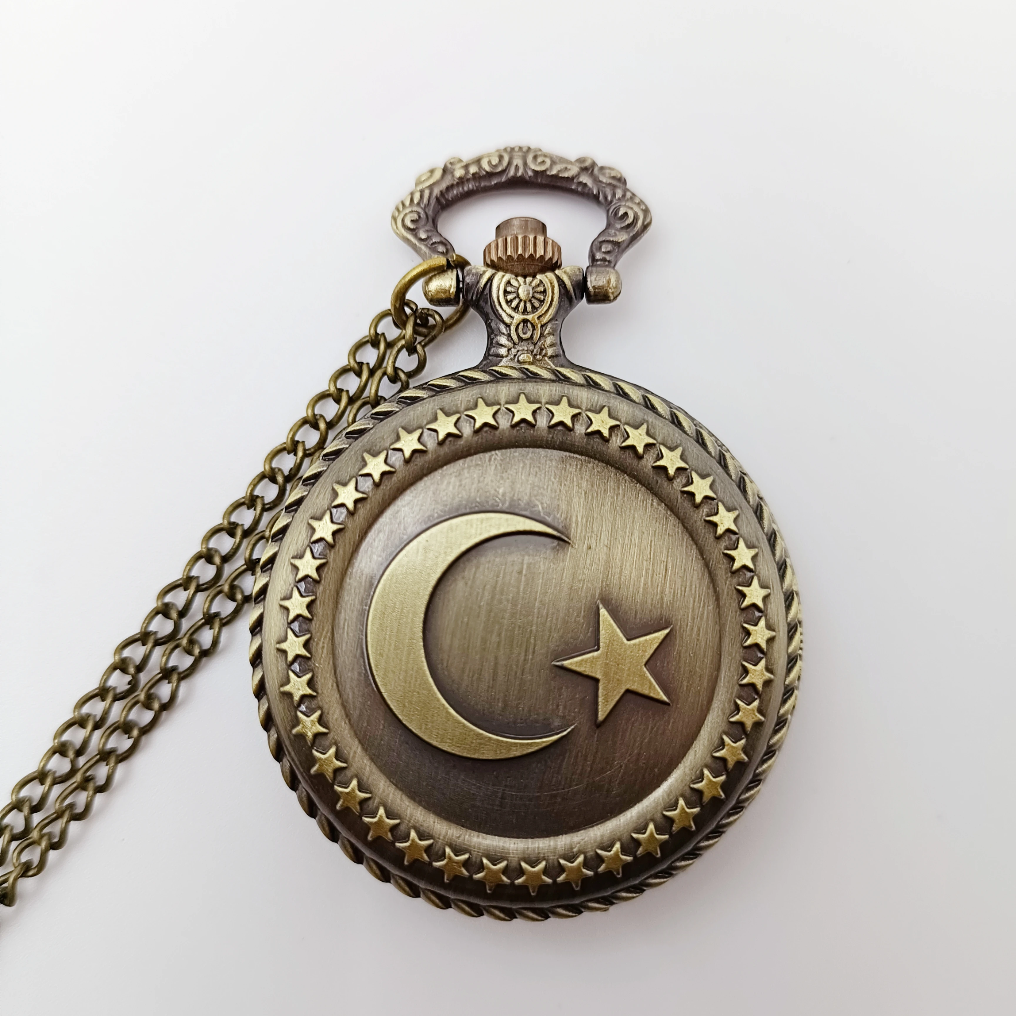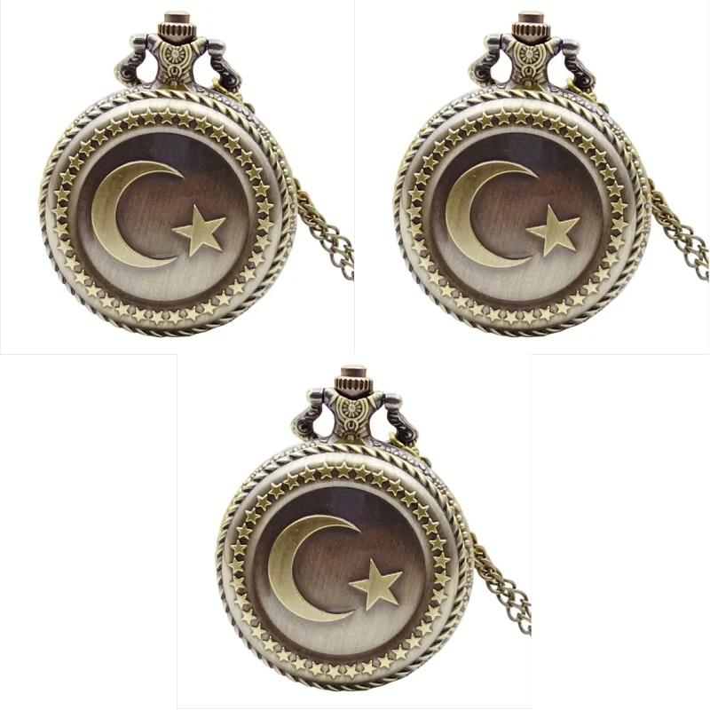 Montre de poche à quartz gravée étoile et lune pour hommes et femmes, collier vintage, bronze, cadeaux de vacances