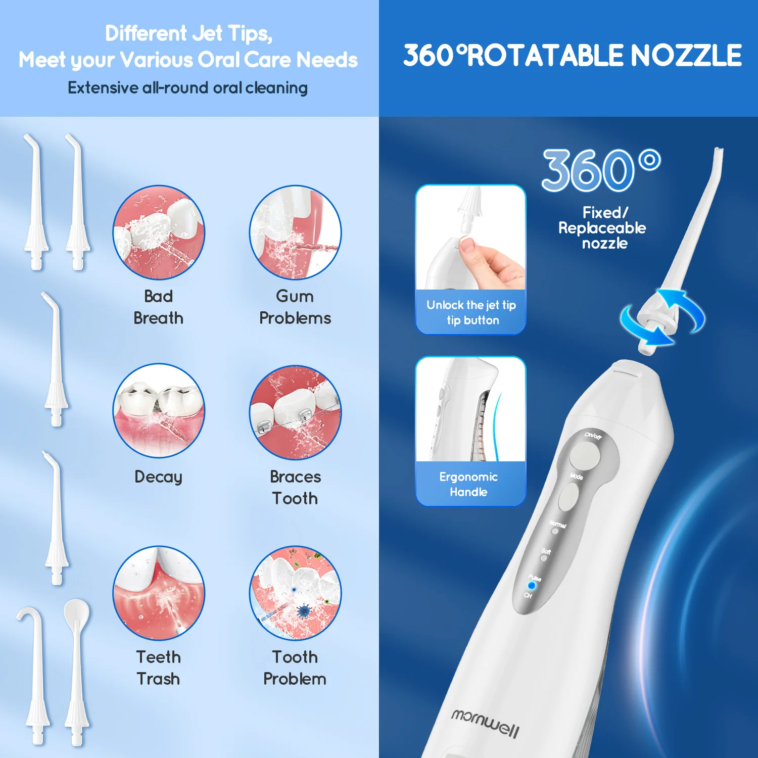 Mornwell hydropulseur dents pics 4 Jets 3 Modes Portable sans fil D52 fil à eau pour nettoyeur de dents IPX7 étanche pics buccaux