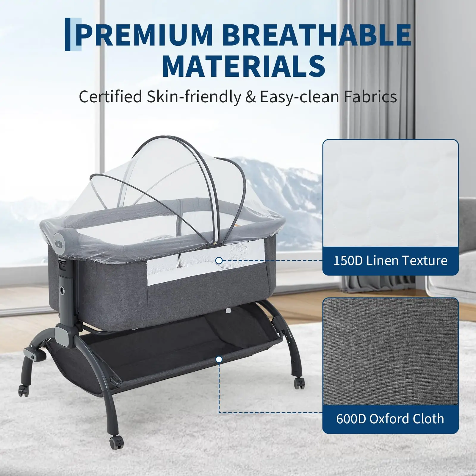 Côtés en maille souple = excellente circulation de l'air + vue dégagée sur votre bébé👶.La hauteur réglable s'adapte parfaitement à votre lit : pas d'espace, juste un co-sleeping sécurisé pour les repas de nuit !