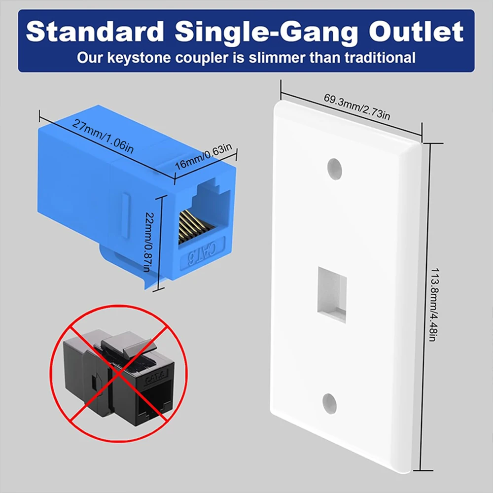 Les deux coupleurs en ligne Keystone Cat Female 6 et les plaques murales de décoration de taille standard à 1 port offrent une gamme complète de solutions pour les réseaux domestiques et le bureau, l'audio, la vidéo et d'autres projets de bricolage.