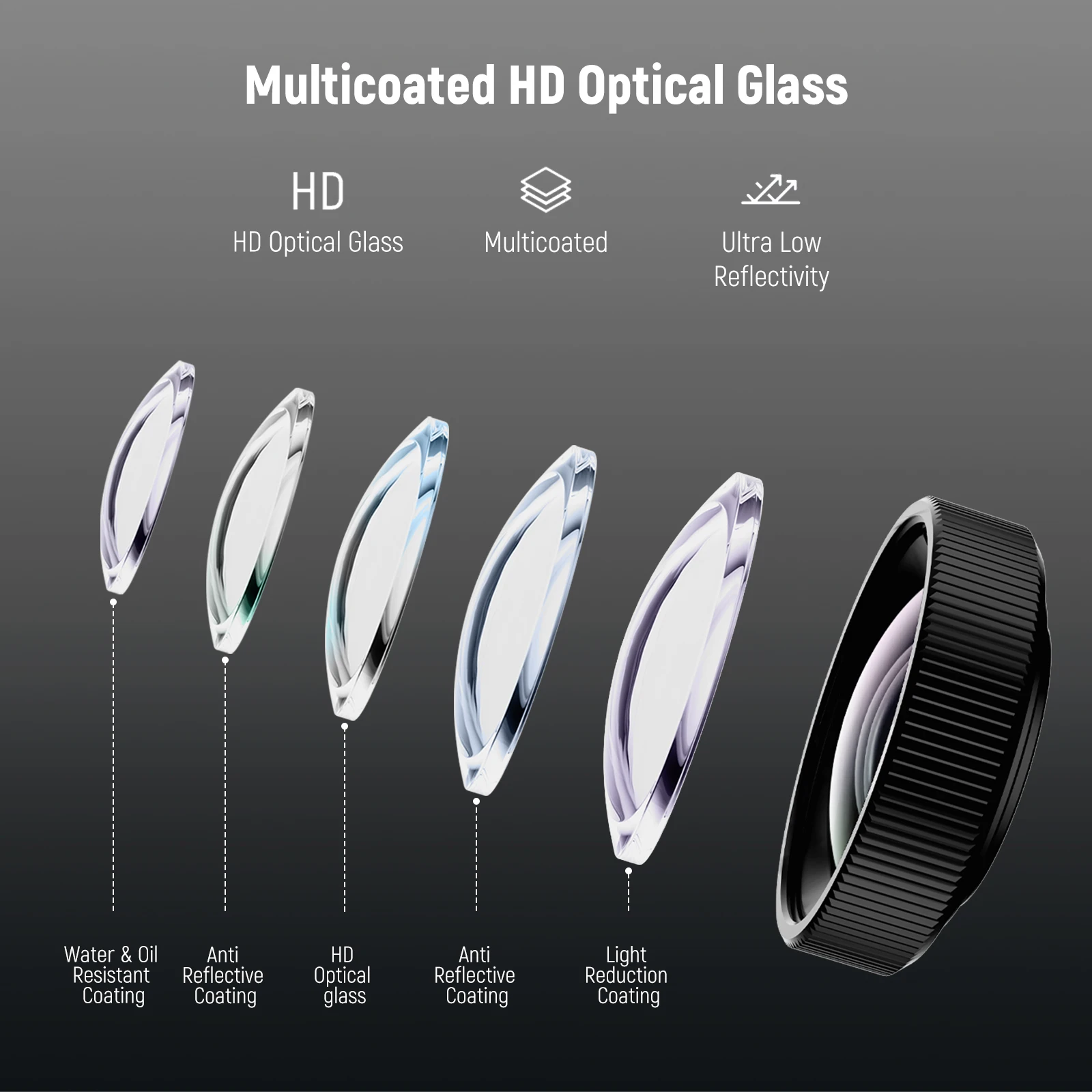 Le verre optique HD avec 2 éléments en 1 groupe assure une grande clarté.Plusieurs revêtements de protection à faible réflectance réduisent efficacement l'éblouissement et les images fantômes tout en résistant aux taches et aux empreintes digitales.