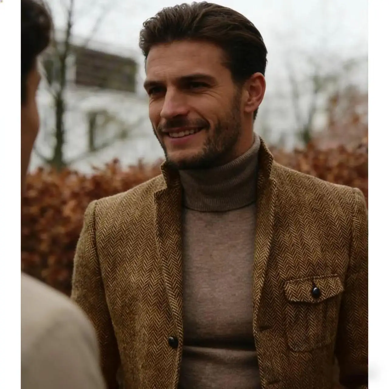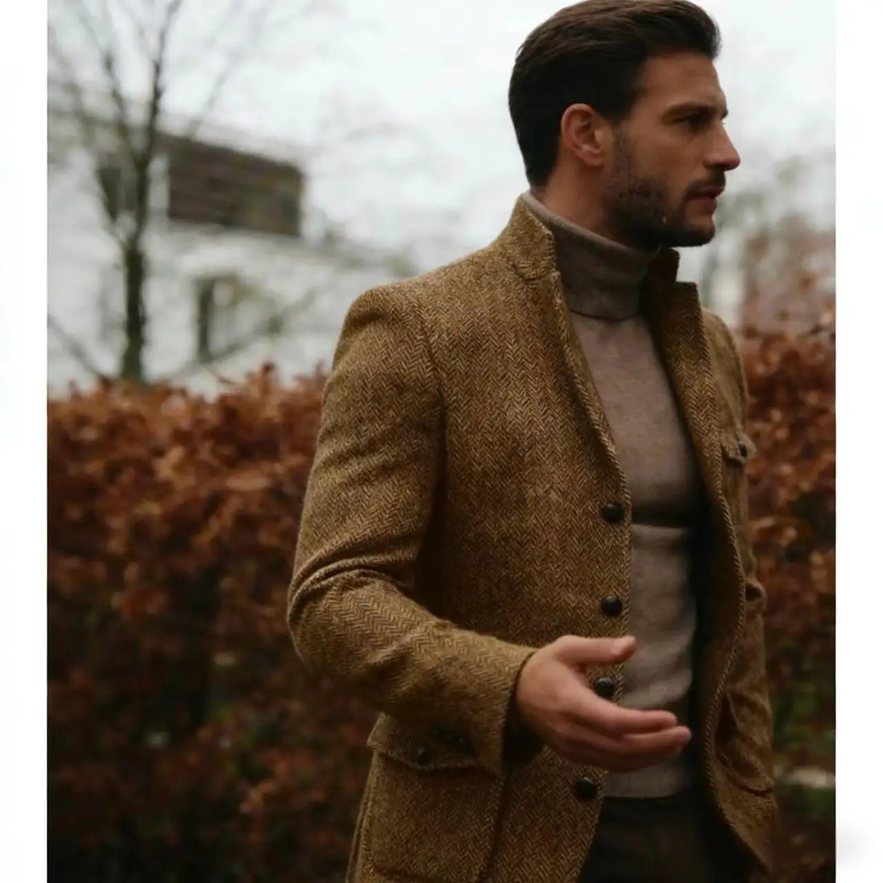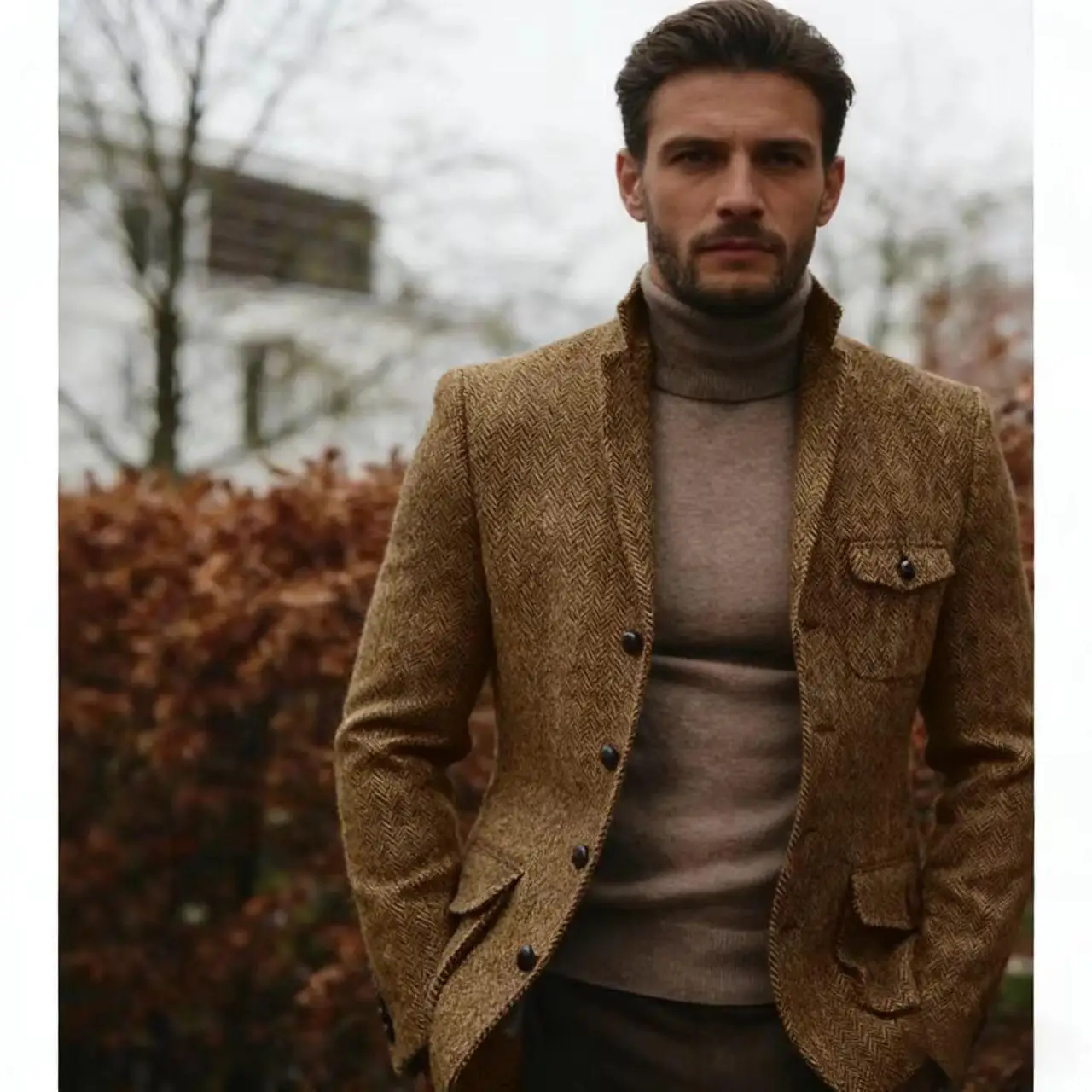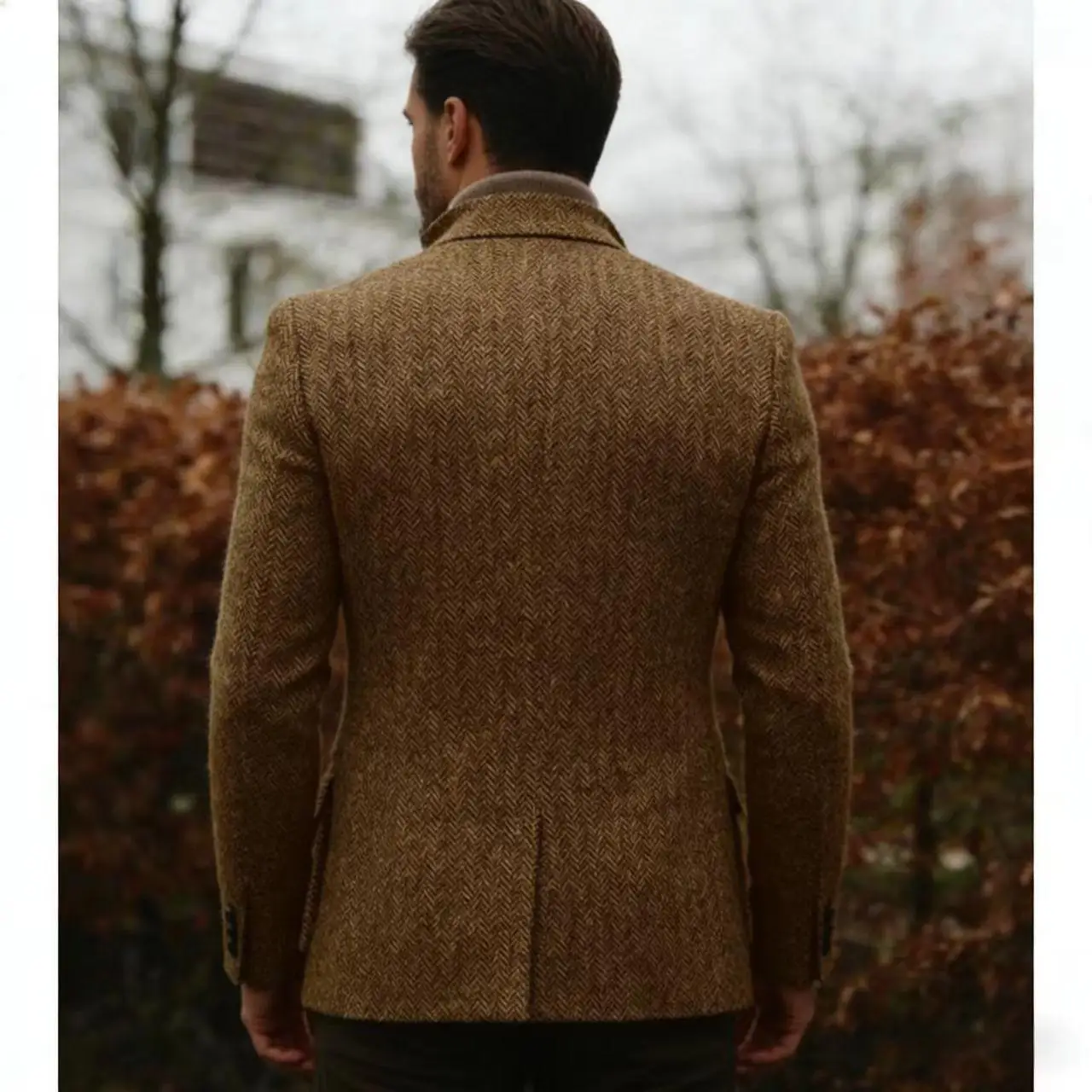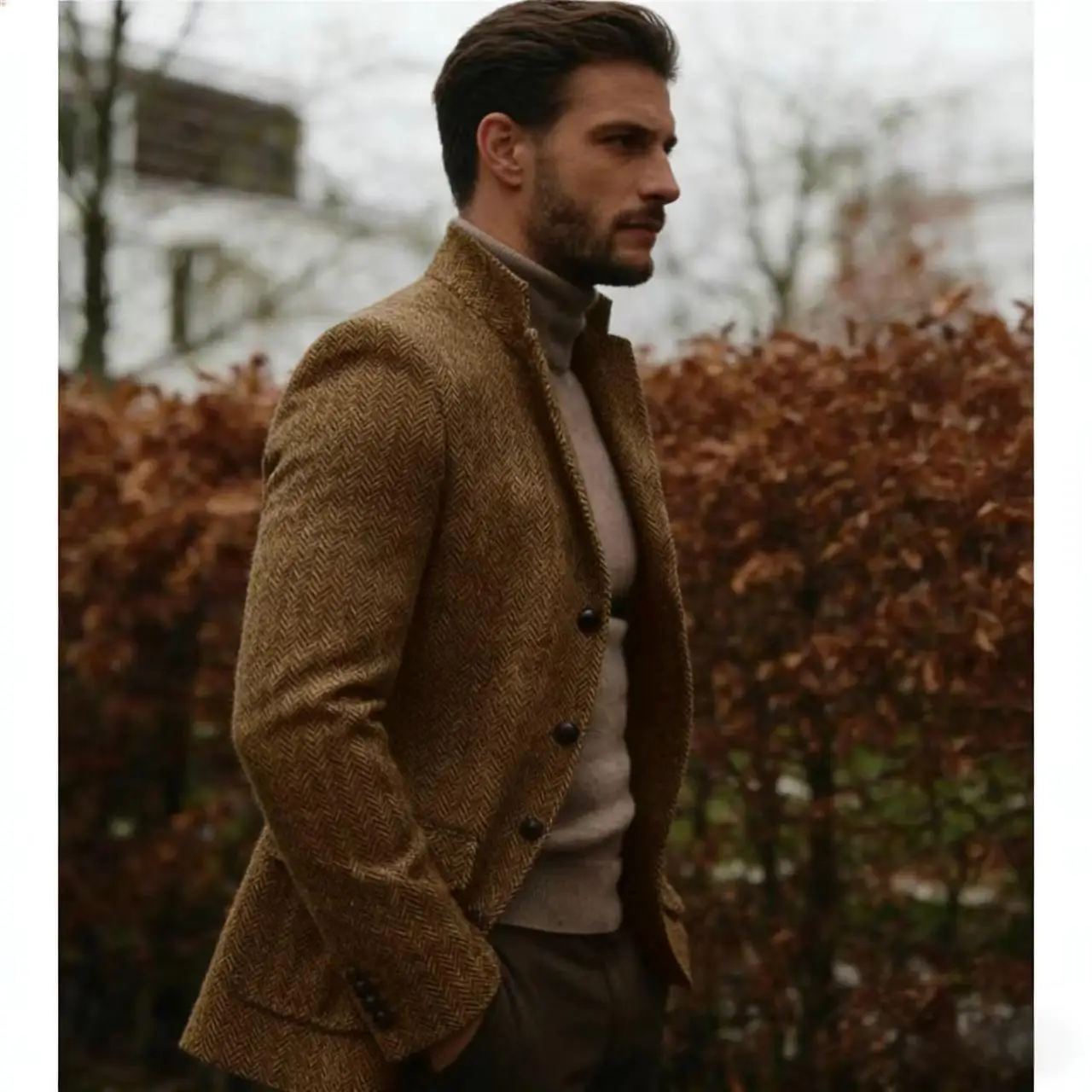 Nouveau Blazer Homme Vintage en Tweed Chevrons Style Britannique Mélange de Laine Léger Veste Décontractée Sportive Coupe Ajustée Veste de Costume Vente Chaude