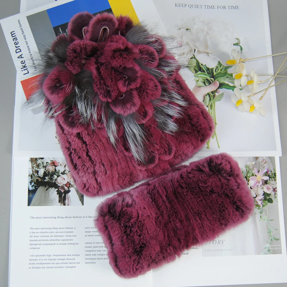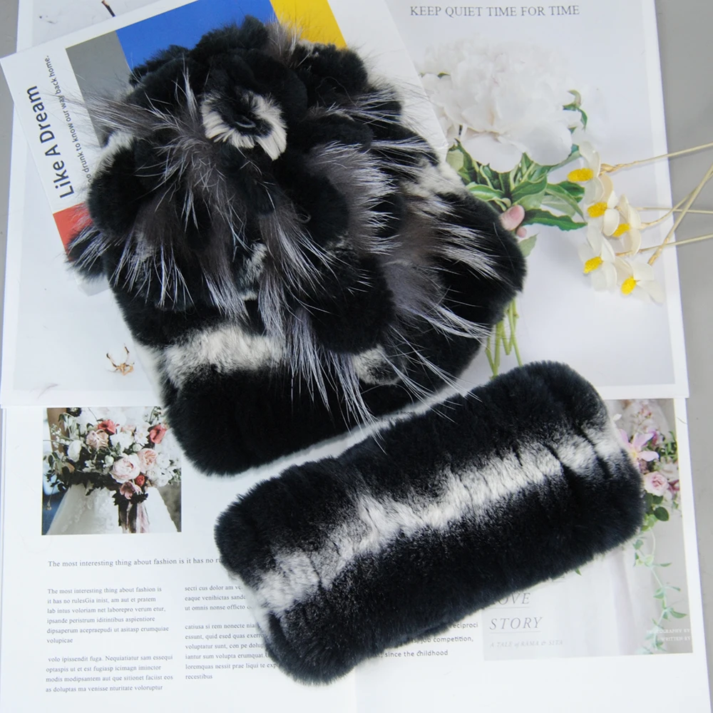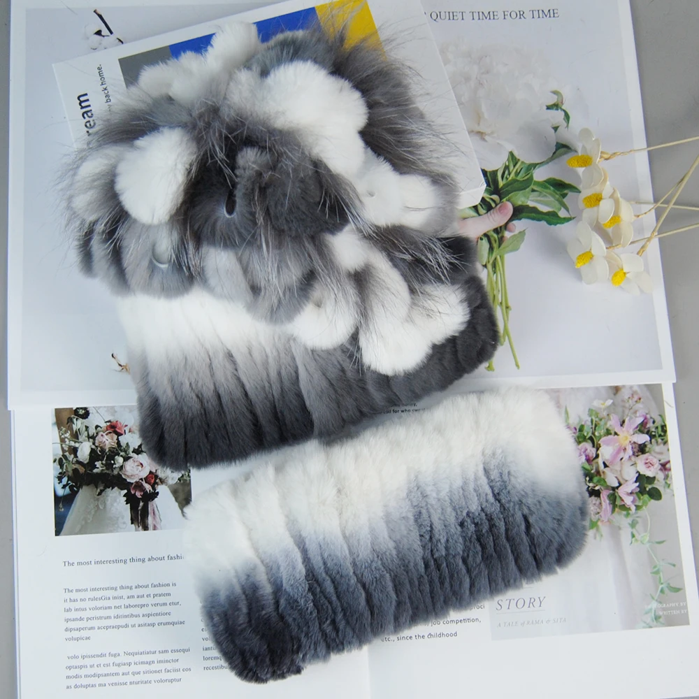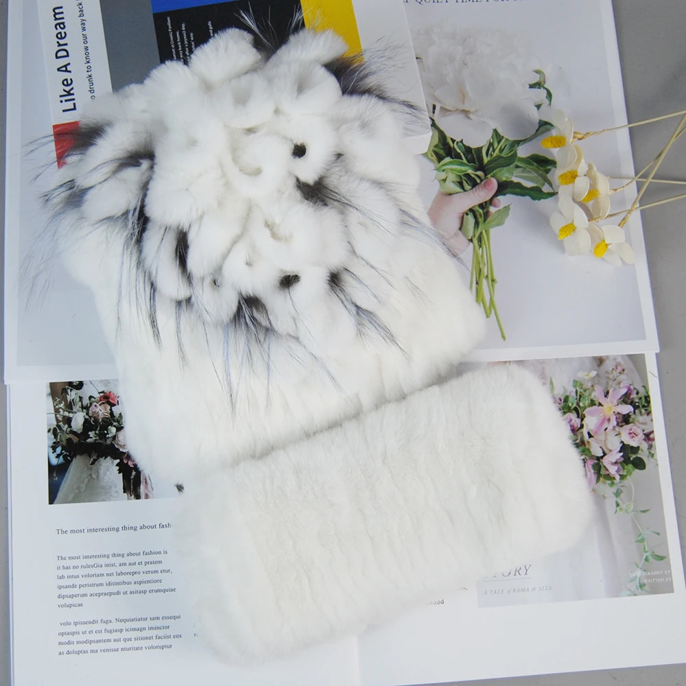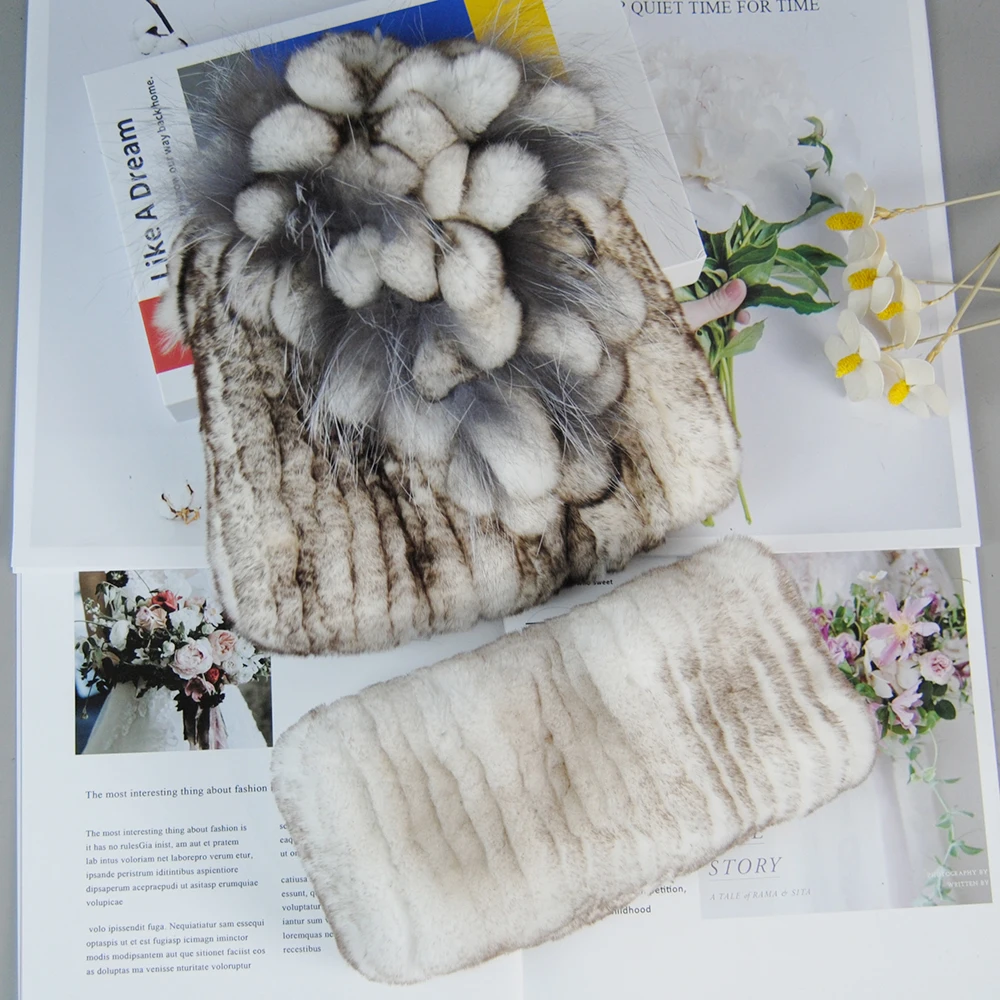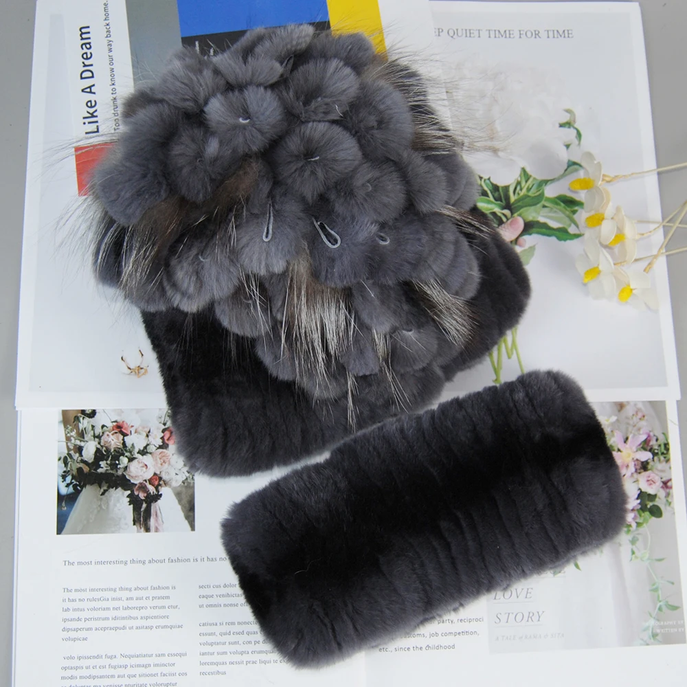 Nouveau Style dame tricot fourrure chapeaux silencieux 2 pièces femmes chaud Rex lapin fourrure chapeau écharpe ensembles hiver naturel Rex lapin fourrure casquette foulards