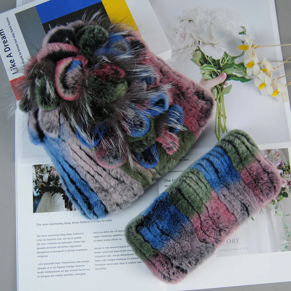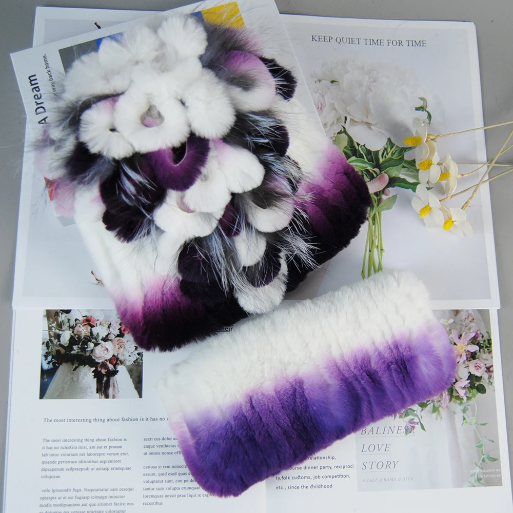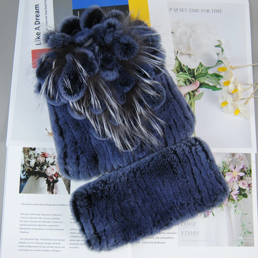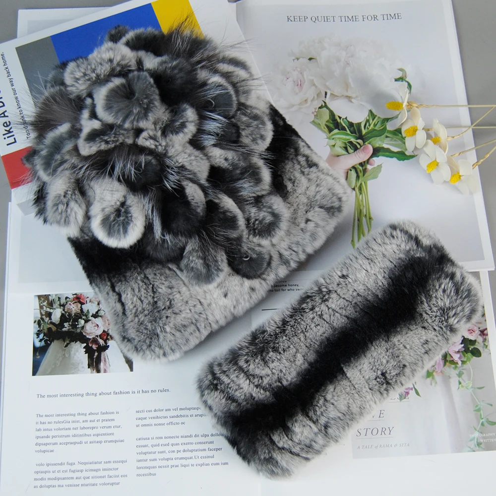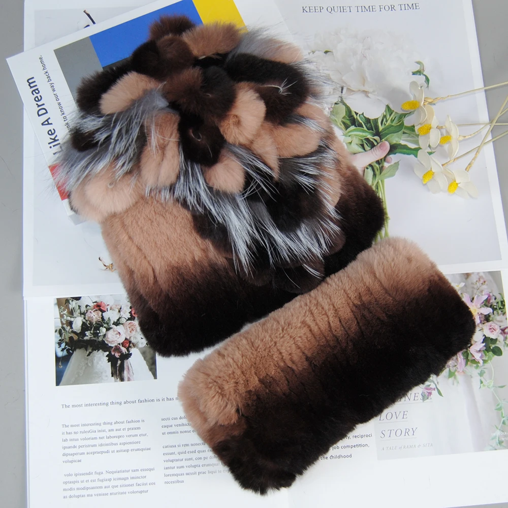 Nouveau Style dame tricot fourrure chapeaux silencieux 2 pièces femmes chaud Rex lapin fourrure chapeau écharpe ensembles hiver naturel Rex lapin fourrure casquette foulards