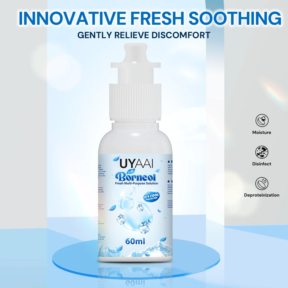 ❤Emballage : 60 ml * 1 Solution de soin de lentilles de contact Ice Cool Protection ❤Pour : lentilles de contact, santé oculaire Caractéristiques : ❤Extrait d'essence de bornéol innovant ❤Frachissant ❤Soulager en douceur l'inconfort ❤Supprimer efficacement les protéines ❤Hydratation améliorée des yeux ❤Durée de conservation : ❤2 ans avant ouverture ❤30 jours après ouverture ❤AVIS : Il est normal d'avoir une légère sensation de froid lors de l'utilisation du produit.