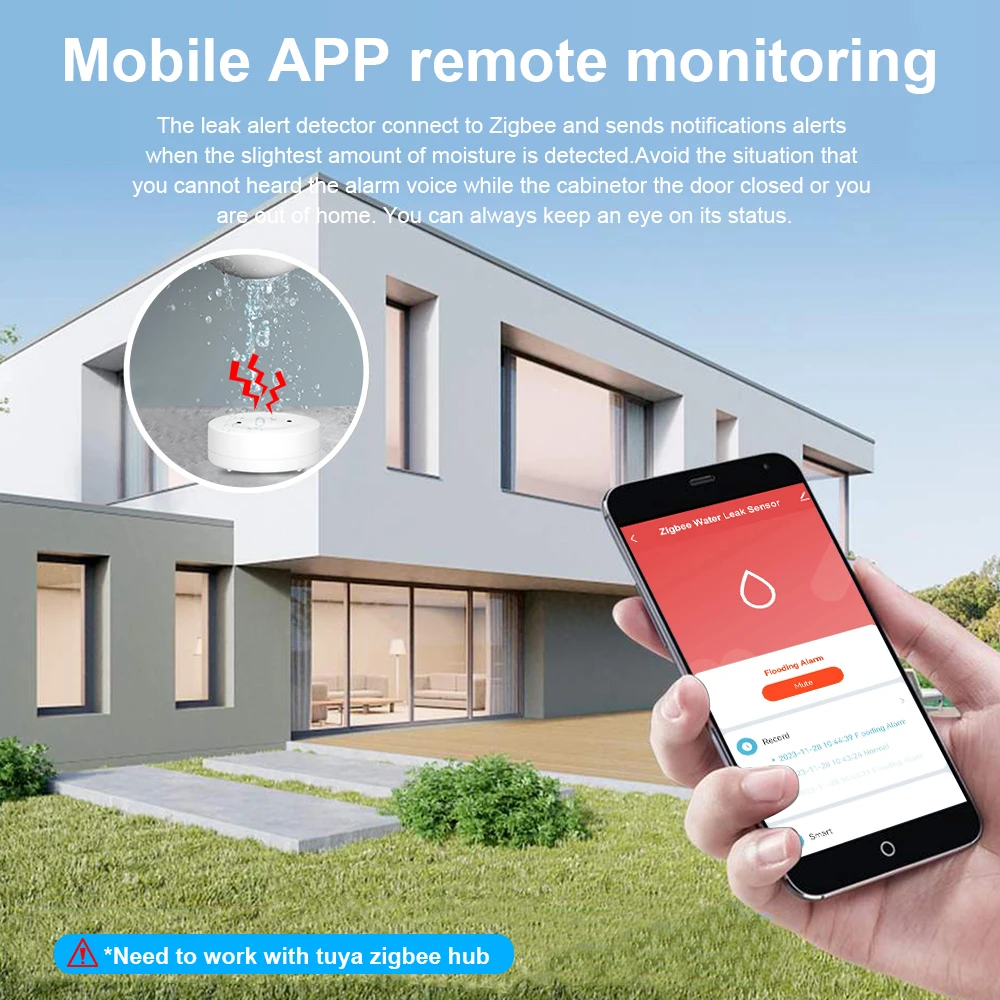 ONENUO Tuya ZigbeeWater Leak Sensor Flood Leakage Detector with Sound Alarm 80dB and IP55 WaterProof Water Sensor Remote Monitor Product parameters: ◆ APP name: Tuya Smart or Smart Life ◆ Battery type: AAA1.5V*2 (Not included in shipment) ◆ Low-battery remind function ◆ Zigbee: Zigbee gateway needed! ◆ Sound alarm level: 80dB (within 1m) ◆ Waterproof level: IP55 ◆ Water leak detection ◆ Support all Tuya smart product Linkage control ◆ Working Temperature: 0℃~40℃ ◆ Working Humidity: 20%~85% RH ◆ Storage Humidity: 0% ~ 90% RH Product package included: 1xSensor (Not include battery) 1xUser manual Product Image: