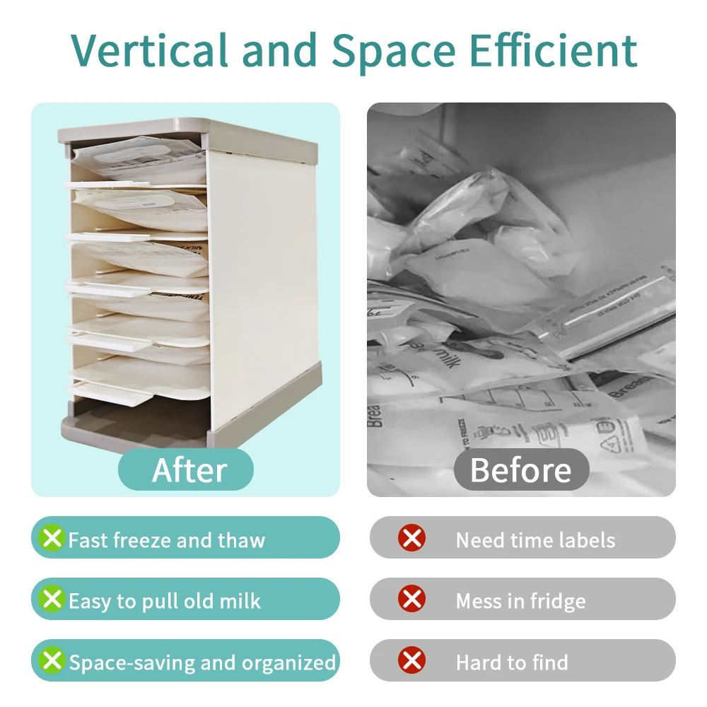 Qu'est-ce qui le rend indispensable pour l'allaitement?Plus besoin de fouiller autour du congélateur pour des sacs de rangement ou de vous soucier de les étiqueter!Et vos sacs de lait maternel seront organisés et faciles à trouver avec cet organisateur de stockage de lait maternel pour congélateur.Il y a deux fentes sur le dessus et le bas de la tour de stockage du lait maternel.Le supérieur est utilisé pour mettre du nouveau lait maternel, tandis que celui du bas est utilisé pour sortir facilement le lait plus ancien.Il se distingue également entre les repas néonataux et adultes