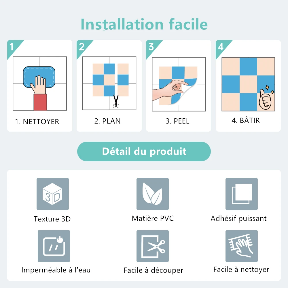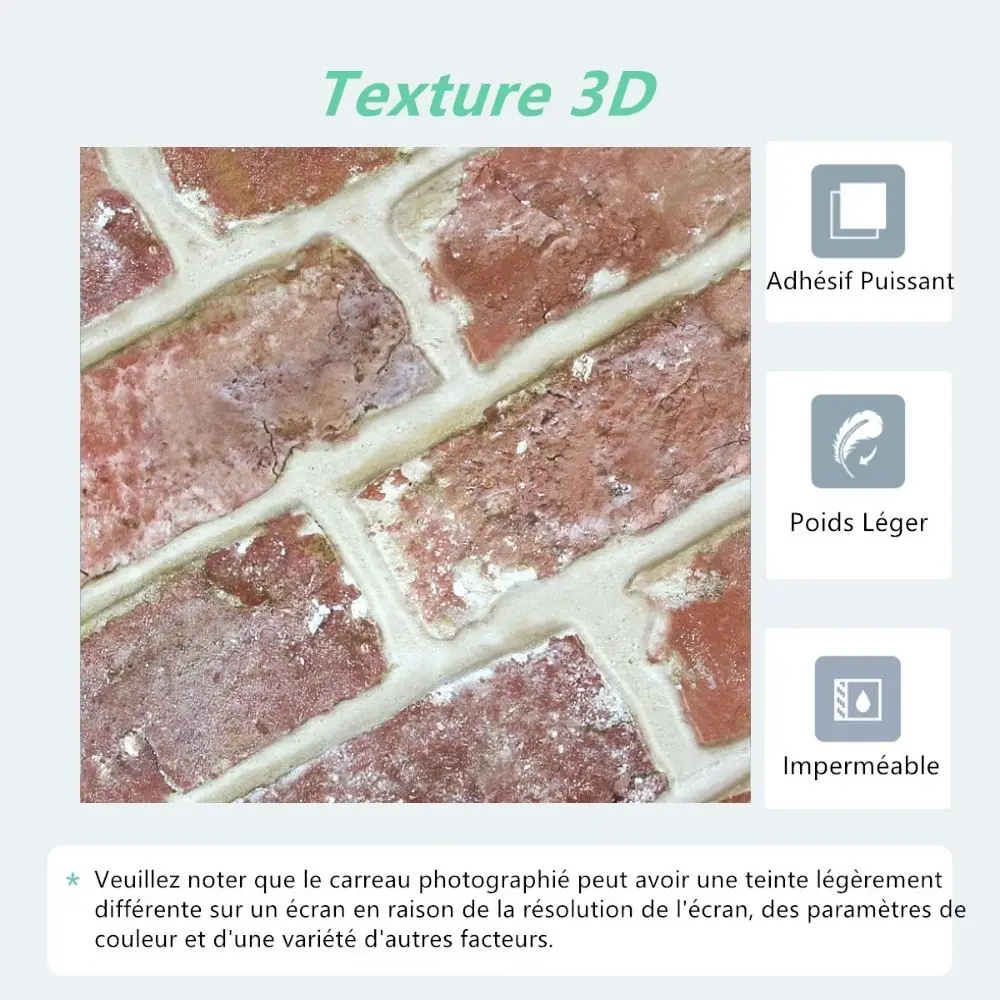 Caractéristique du produit Superbe texture en relief 3D : Les surfaces 3D réalistes simulent parfaitement diverses briques et sont légères et flexibles. Qualité supérieure : Fabriqué à partir de matériaux respectueux de l'environnement, sans dioxines.Résistant à l'eau et à la chaleur, pas de décoloration. Adhésif amélioré plus résistant : Collez fermement sur la surface lisse et propre et disponible sur des murs légèrement texturés. Installation rapide et facile : Il suffit de décoller et de coller!Pas de coulis, pas de ciment et pas de gâchis!Coupe facile avec le couteau utilitaire ou les ciseaux.Parfait pour un projet de bricolage de décoration murale. Largement applicable : Salon, mur TV, chambre, cuisine, salle de bain, buanderie, couloir, bureau, Camping-car/camping-car, et. Détail du produit Matériel principal : PVC Type de Surface : Mat Résistant à l'eau : Oui Résistant à la chaleur : Oui *Les photos de nos produits sont des images réelles.La photographie sur cette page est uniquement à titre de représentation.Veuillez noter que le carrelage photographié peut sembler avoir une teinte légèrement différente sur un écran en raison de la résolution de l'écran, des paramètres de couleur et d'une variété d'autres facteurs. *Achetez suffisamment de carreaux à la fois.Veuillez considérer la perte de coupe de 10 % et l'achat. carrelage gh à la fois pour s'assurer qu'ils proviennent du même lot afin d'éviter une légère différence de couleur. Ce qui est inclus 10 feuilles par paquet 9,7 pieds carrés / 0.9㎡ pour 10 feuilles 11,8 pouces x 11,8 pouces x 0,1 pouces / 30 cm x 30 cm x 0,3 cm par feuille Installation facile tape 1 - Nettoyez et séchez soigneusement votre mur. *Conseils : Si vos murs sont frachement peints, attendez jusqu'à trois semaines avant d'appliquer le carrelage. tape 2 - Planifiez l'endroit o vous souhaitez installer et coupez la taille en conséquence pour mieux s'adapter au mur. tape 3 - Décollez le support et collez côte à côte pour une apparence homogène. tape 4 - Ferme une fois que vous êtes assuré d'un placement avec un plastique plus lisse pour garantir la meilleure adhérence possible, en particulier les conduites de coulis ou la zone la plus concave de la surface du carrelage. CONSEILS IMPORTANTS Généralement, l'adhésif de support complétera la liaison au mur dans les 48 heures.Après 24 heures d'installation, appuyez à nouveau fermement sur les conduites de coulis pour garantir une adhérence plus parfaite. Nos carreaux adhésifs peuvent être placés sur toutes les surfaces propres et élégantes.Ils ne conviennent pas aux environnements extérieurs ou au sol. Si vous souhaitez retirer le carrelage, utilisez un pistolet thermique ou un sèche-cheveux pour réchauffer la colle et tirez doucement en commençant par les coins, cela n'endommagera pas le mur. En cas d'utilisation de longue durée, nous vous recommandons de garder une distance de 12 pouces ou 30 cm du centre du poêle et de la cheminée. Nous vous déconseillons d'installer nos carreaux de décoration murale 3D dans votre douche car ils seront en contact direct avec l'eau.