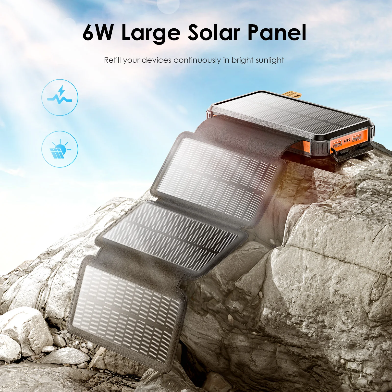 Banque d'énergie solaire portable : il existe 4 modules solaires à haut rendement, la vitesse de charge solaire peut atteindre 6 W et la banque d'énergie solaire peut être pliée pour une portabilité facile.Et dispose d’une plus grande zone de charge solaire.