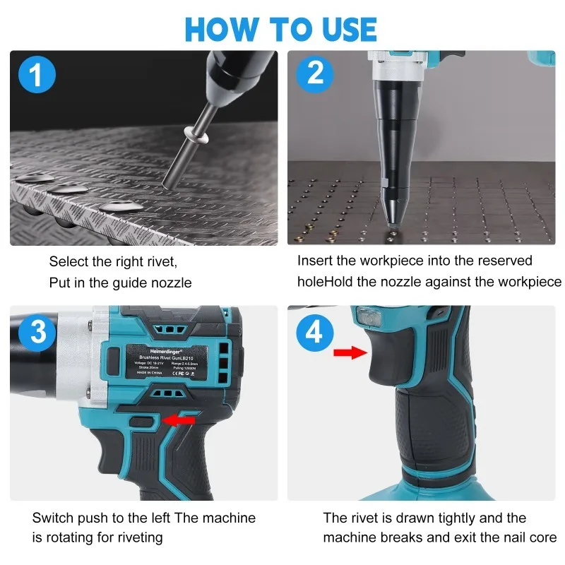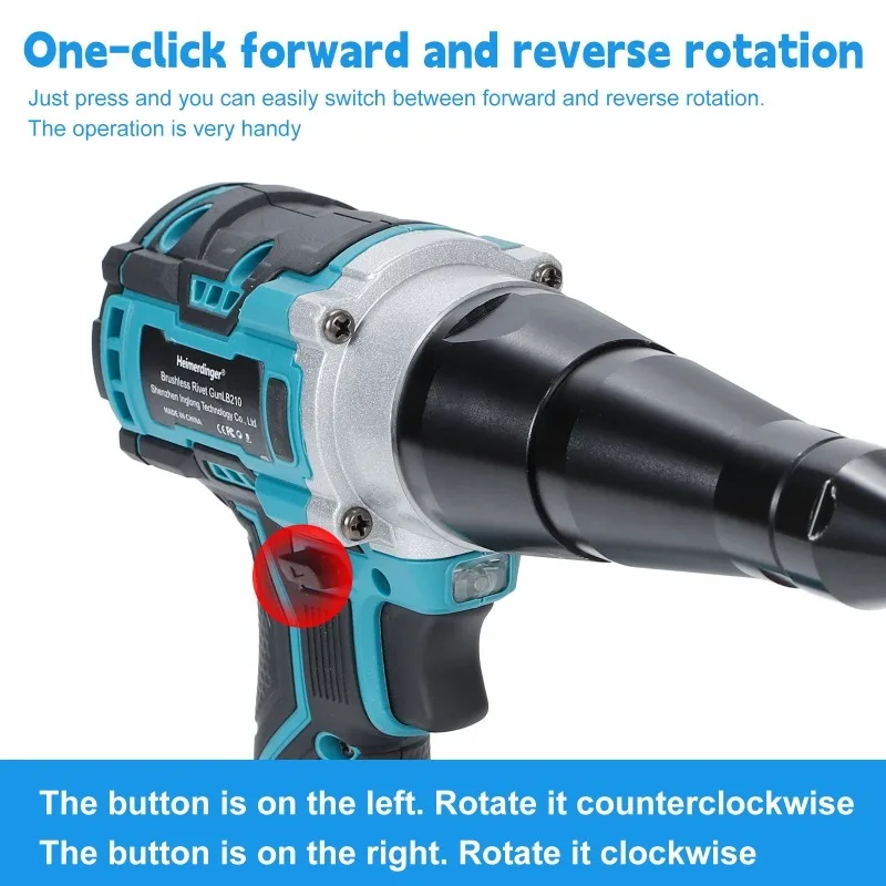 Pistolet à rivets sans balais 18-21 V sans fil, portée de 2,4 à 5,0 cm, force de traction 12 000 N, lumière LED, avant/arrière, refroidissement multi-trous, pas de batterie
