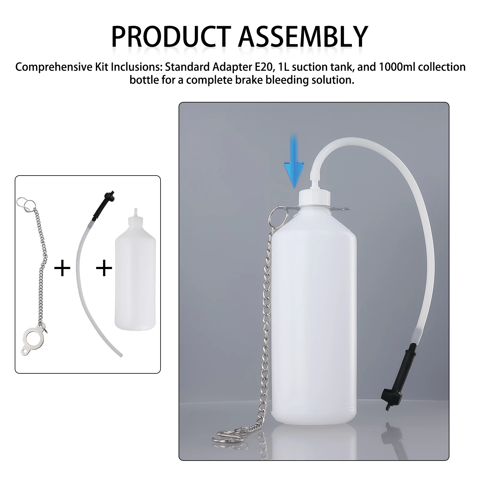 Inclusions complètes du kit : adaptateur standard E20, réservoir d'enchères de 1 L et flacon de collecte de 1000 ml pour une solution complète de purge des freins.