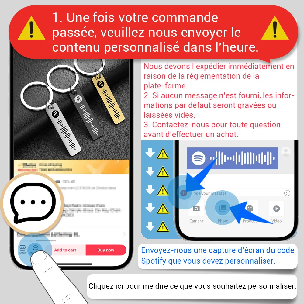 1.Une fois votre commande passée, veuillez nous envoyer le contenu personnalisé dans une heure.