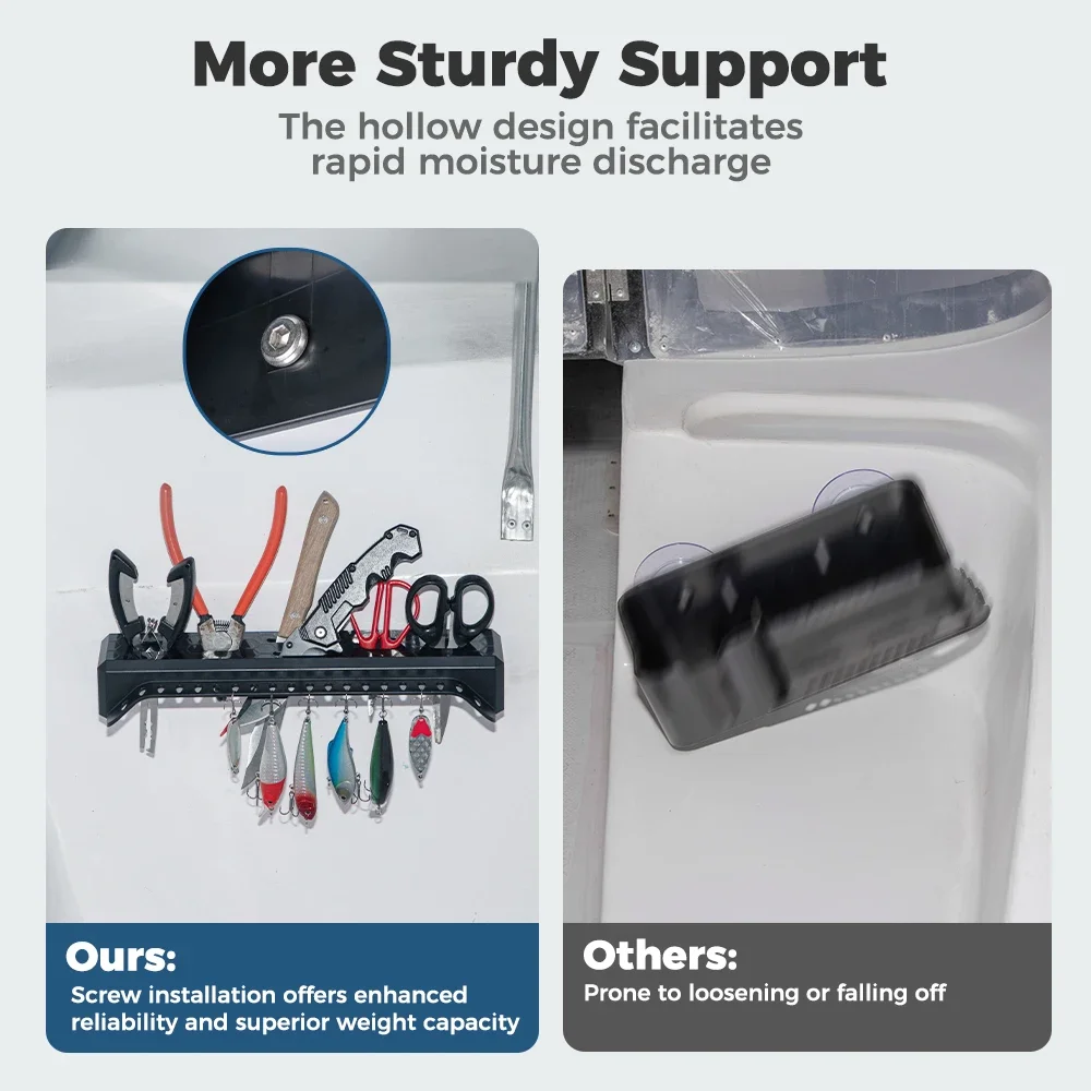 Contrairement à d'autres supports à ventouse qui perdent rapidement leur adhérence, cet organisateur d'appâts de pêche en mer peut être fermement fixé avec des vis, assurant sa stabilité.