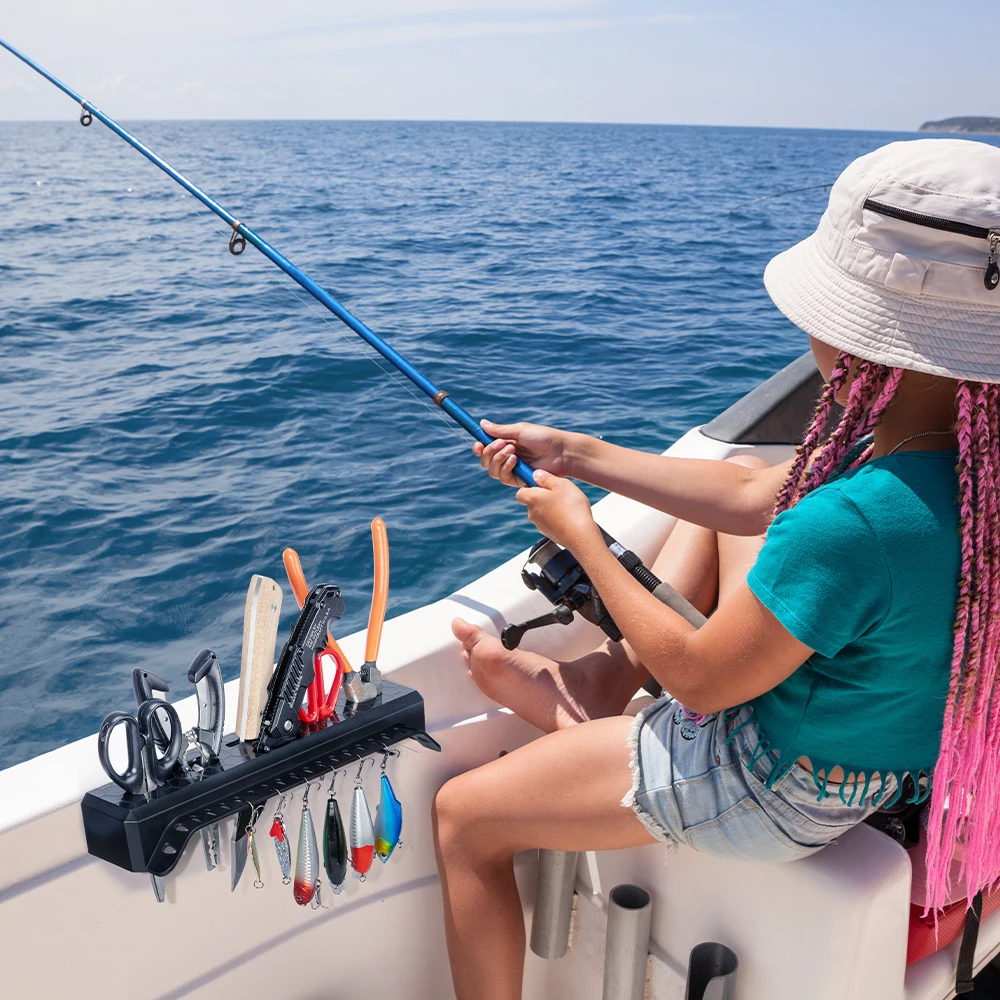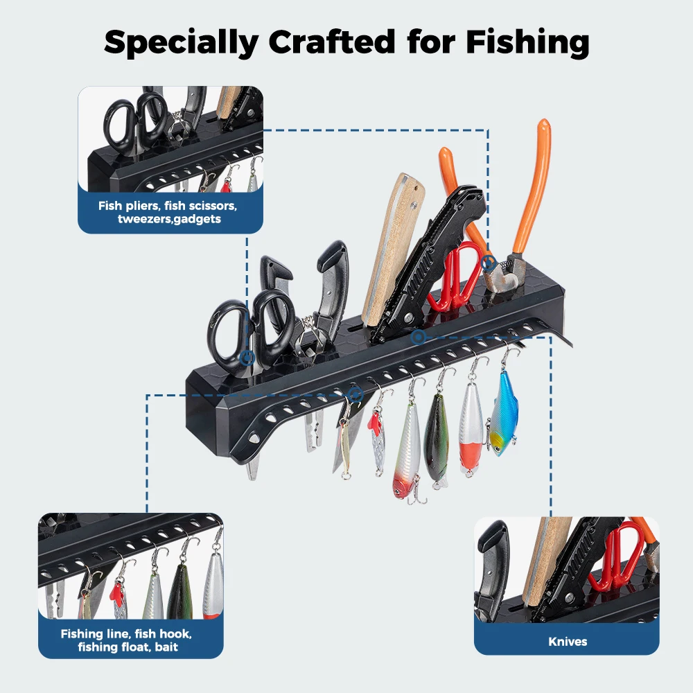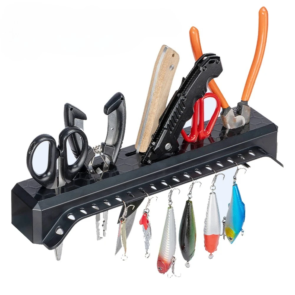 Le porte-outils de pêche peut contenir vos gadgets et autres éléments essentiels.Grâce à ses trous stratégiquement placés le long du bord, vous pouvez facilement accrocher vos lignes de pêche, appâts, petits couteaux, pinces et pinces, garantissant ainsi que votre équipement est toujours parfaitement ordonné et facilement accessible.