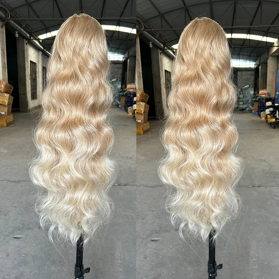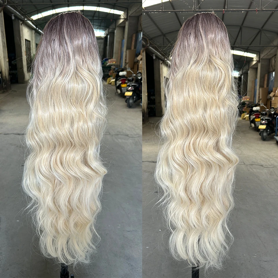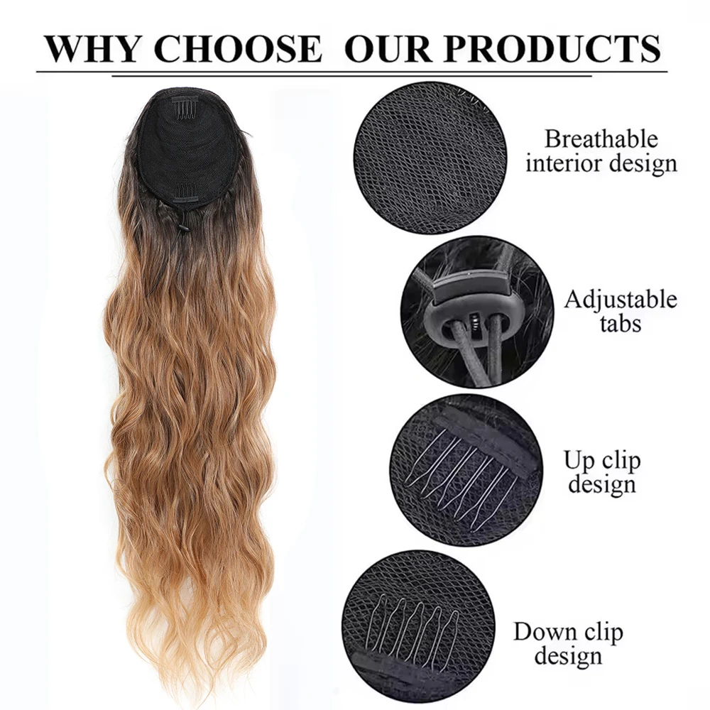 Extension de queue de cheval Magicae 28 pouces Blonde 27/613, 180 grammes, fibre synthétique résistante à la chaleur, ombré brun, ondulée effet "water wave", à clips.