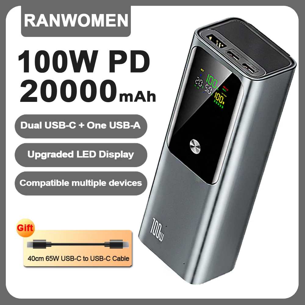 Ranwomen 20000mAh batterie externe haute capacité LED affichage numérique chargeur Portable batterie externe 100W charge rapide pour ordinateur Portable